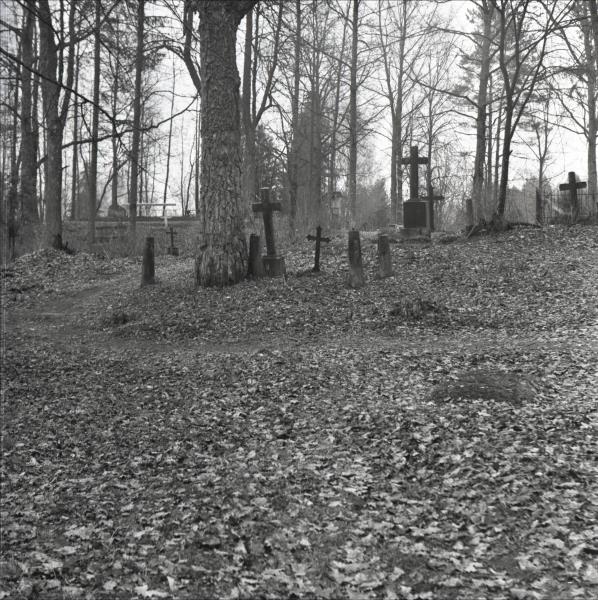 Madlienas kapi: 1906. gada revolucionāra M. Klavika kaps. Skats uz kapa vietu no attāluma. Pie kapa vietas viens metāla krusts un piemineklis - betona krusts. Apkārt betona stabi. Fonā citas kapa vietas, krusti un koki.