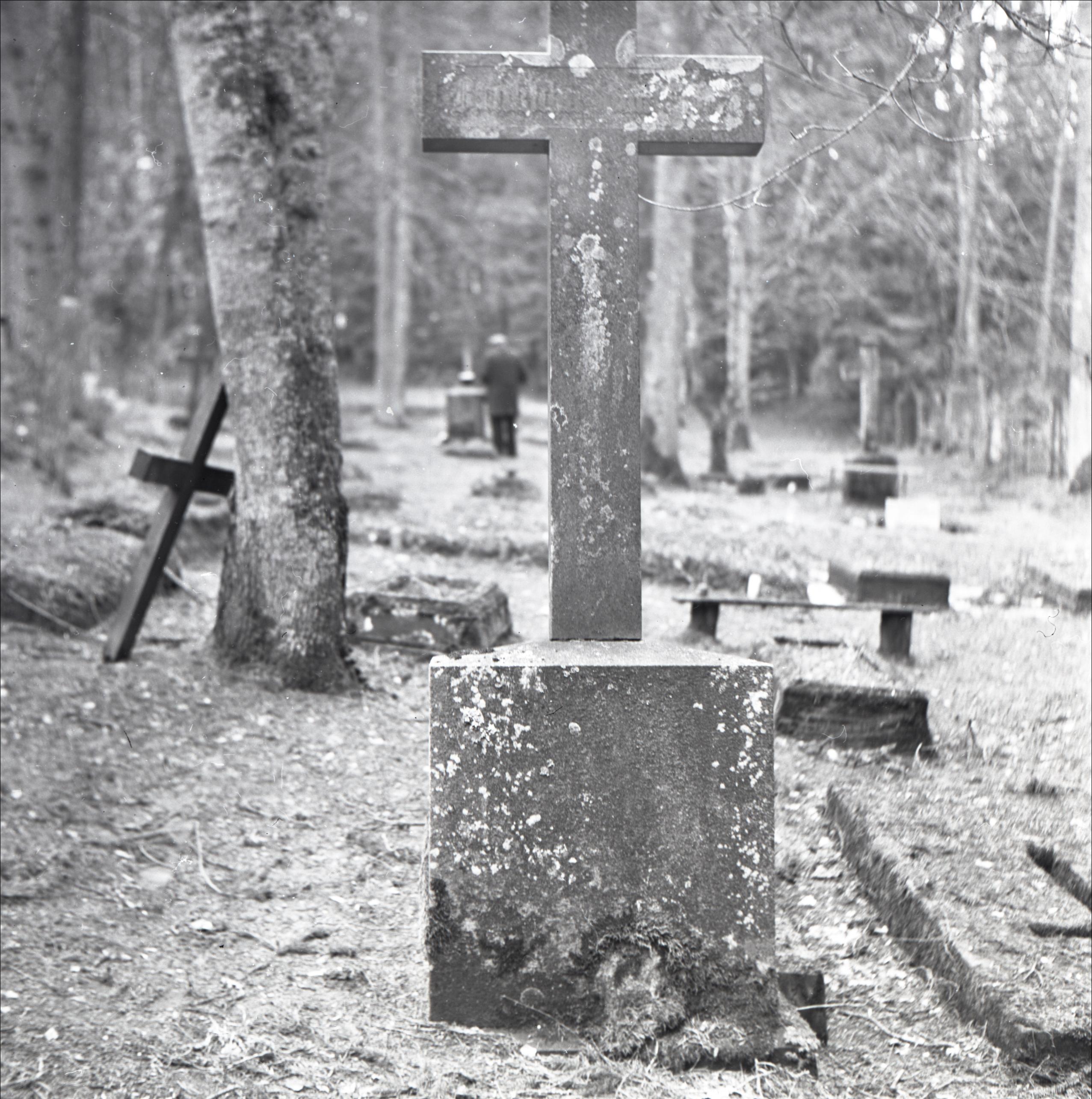 Dūru kapi: Revolucionāra Bunkša kaps. Kapa pieminekļa tuvplāns. Piemineklis - krusts uz paaugstinājuma. Fonā redzamas citas kapa vietas un krusti.