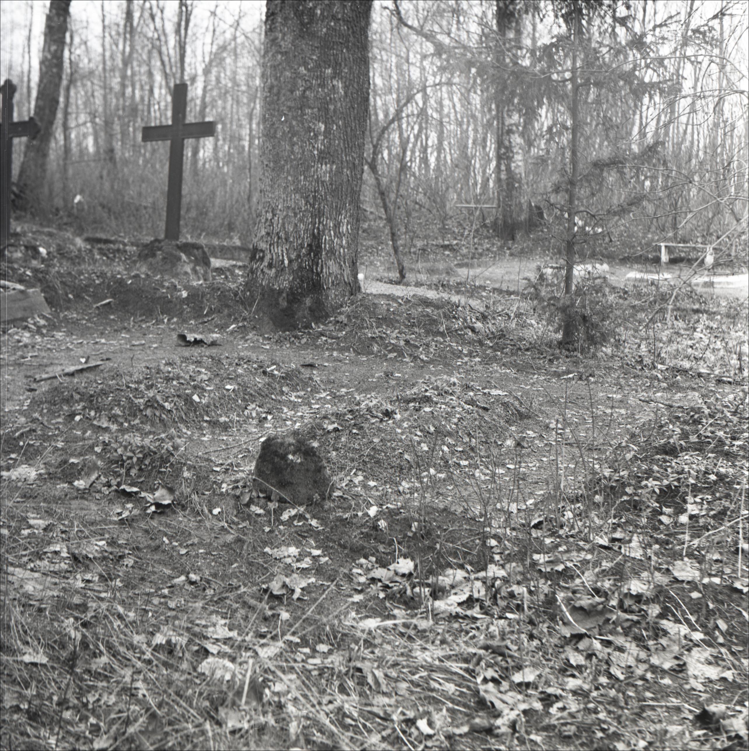Blīdenes kapi: Revolucionāra Veisa kaps. Redzamas divas iekoptas kapa vietas. Fonā citas kapa vietas ar pieminekļiem un krustiem.