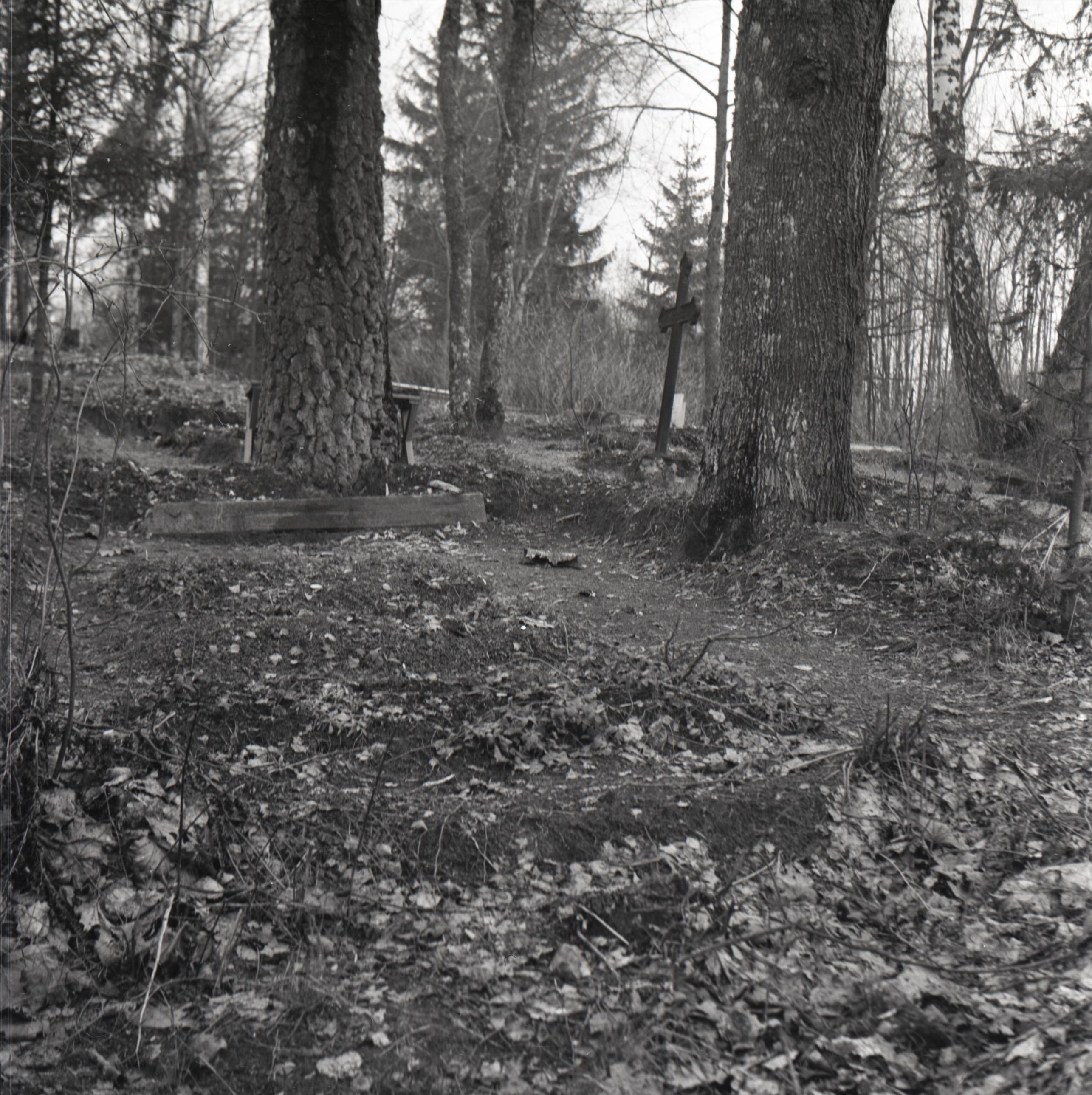 Blīdenes kapi: Revolucionāra Veisa kaps. Skats uz kapa vietu no atstatuma. Priekšplānā iekoptas kapa vietas bez pieminekļiem. Fonā citas kapa vietas un krusti.