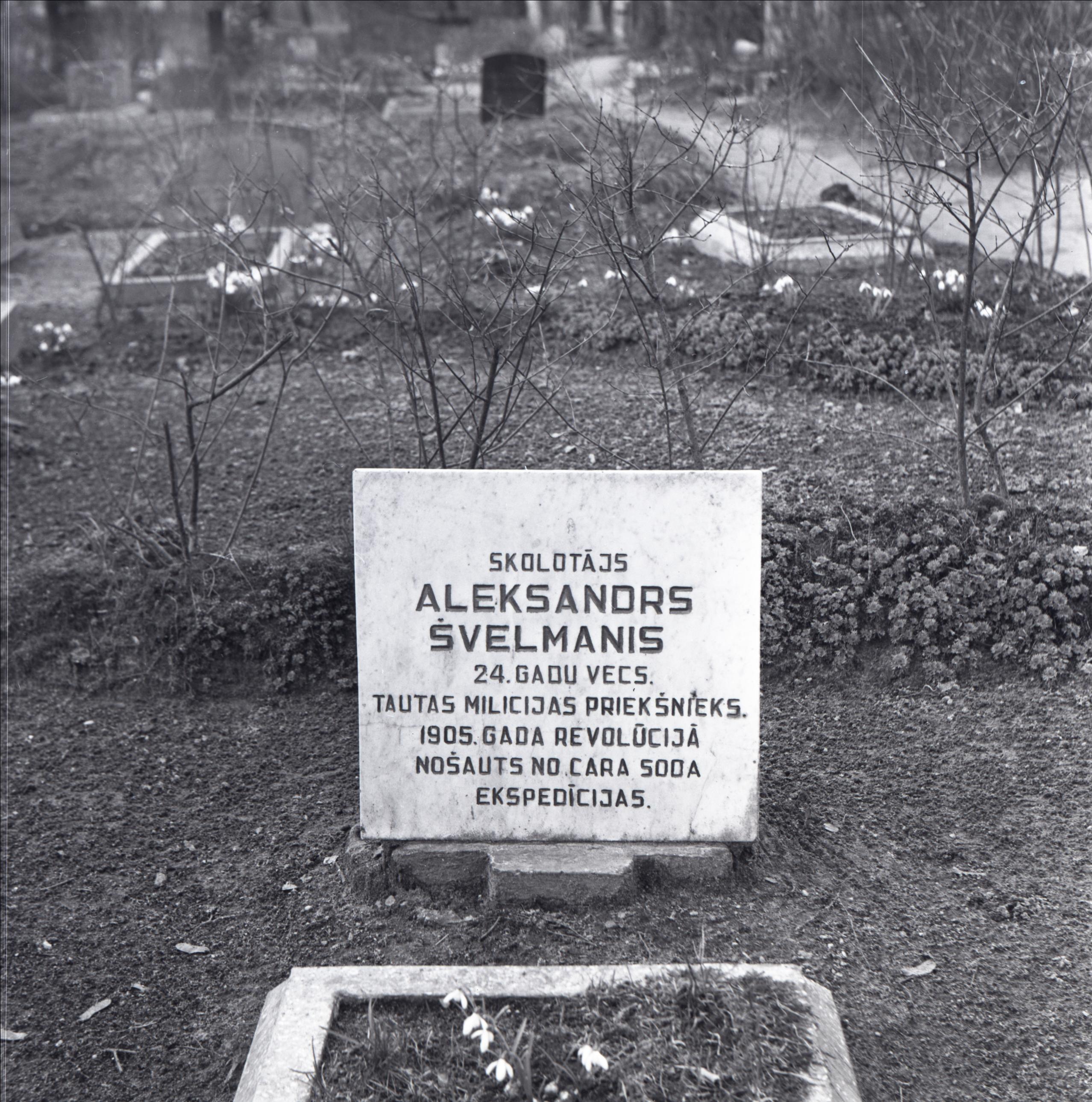 Saldus kapi: Skolotāja Aleksandra Švelmaņa kaps. Kapa pieminekļa tuvplāns. Kapa vieta ierobežota ar betona apmali. Kapa piemineklis no gaiša akmens. Fonā dzīvžogs un citas kapa vietas.