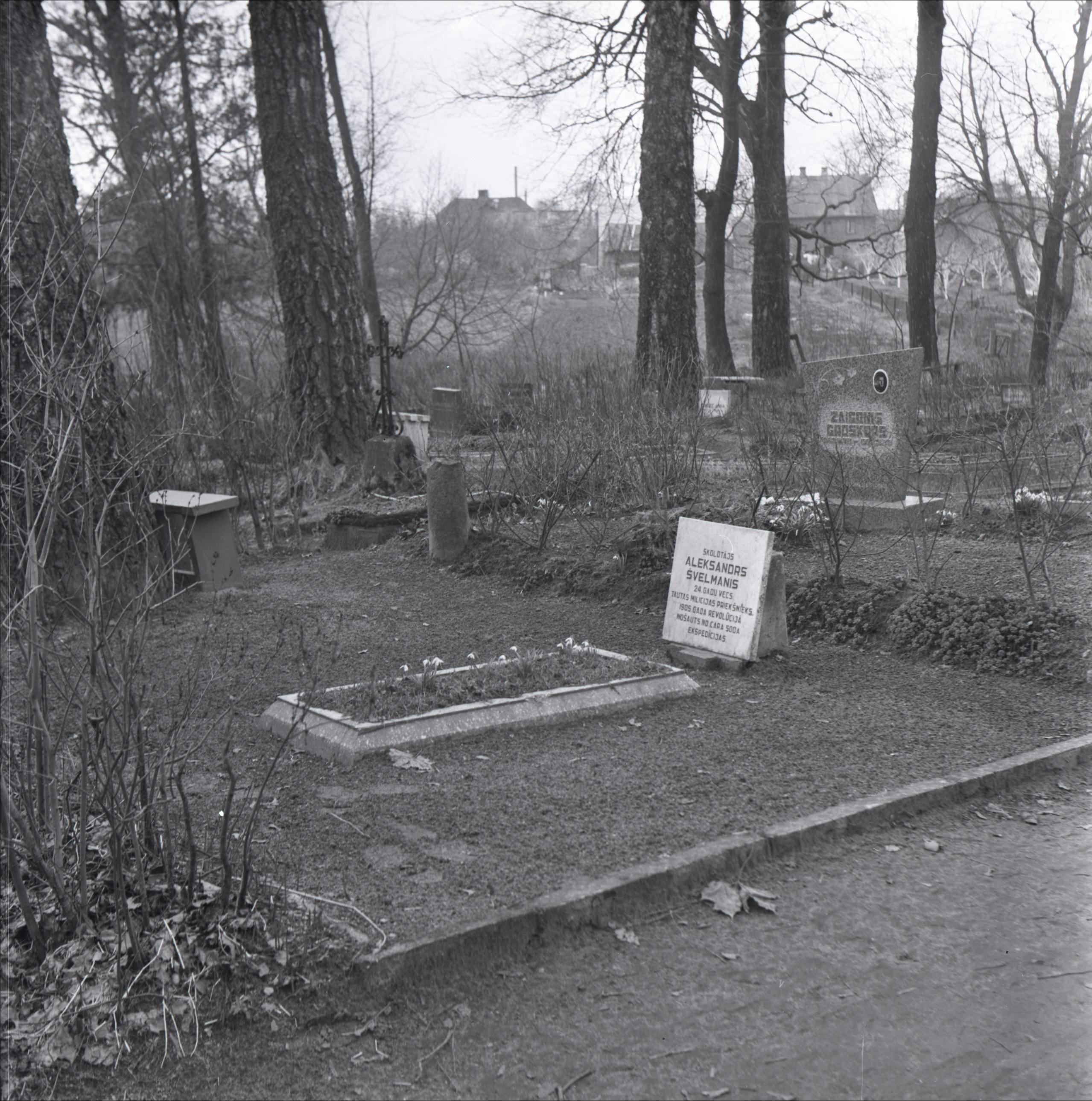 Saldus kapi: Skolotāja Aleksandra Švelmaņa kaps. Skats uz kapa vietu no attāluma. Kapa vieta ierobežota ar betona apmali. Kapa piemineklis no gaiša akmens. Fonā dzīvžogs un citas kapa vietas, tālumā redzamas ēkas.
