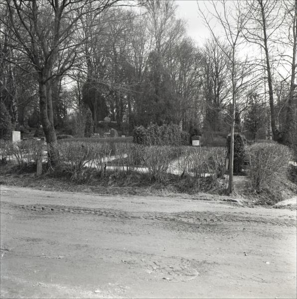 Saldus kapi: Fašistiskā terora upuru kapi. Skats uz kapiem no ceļa otras puses. Priekšplānā ceļš. Starp ceļu un kapiem dzīvžogs. Fonā citas kapu kopas un koki.