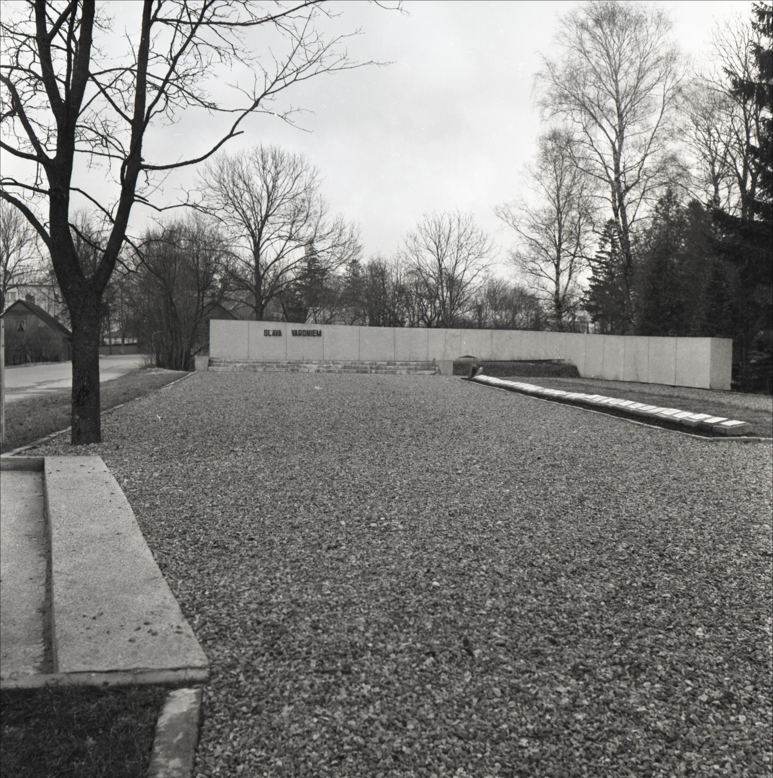 Brāļu kapi: 2. pasaules kara brāļu kapi. Brāļu kapu kopskats. Redzams ar akmeņiem izklāts laukums. Tā vidū josla ar kapa plāksnēm. Tālumā betona siena, uz kuras uzraksts "Slava varoņiem".
