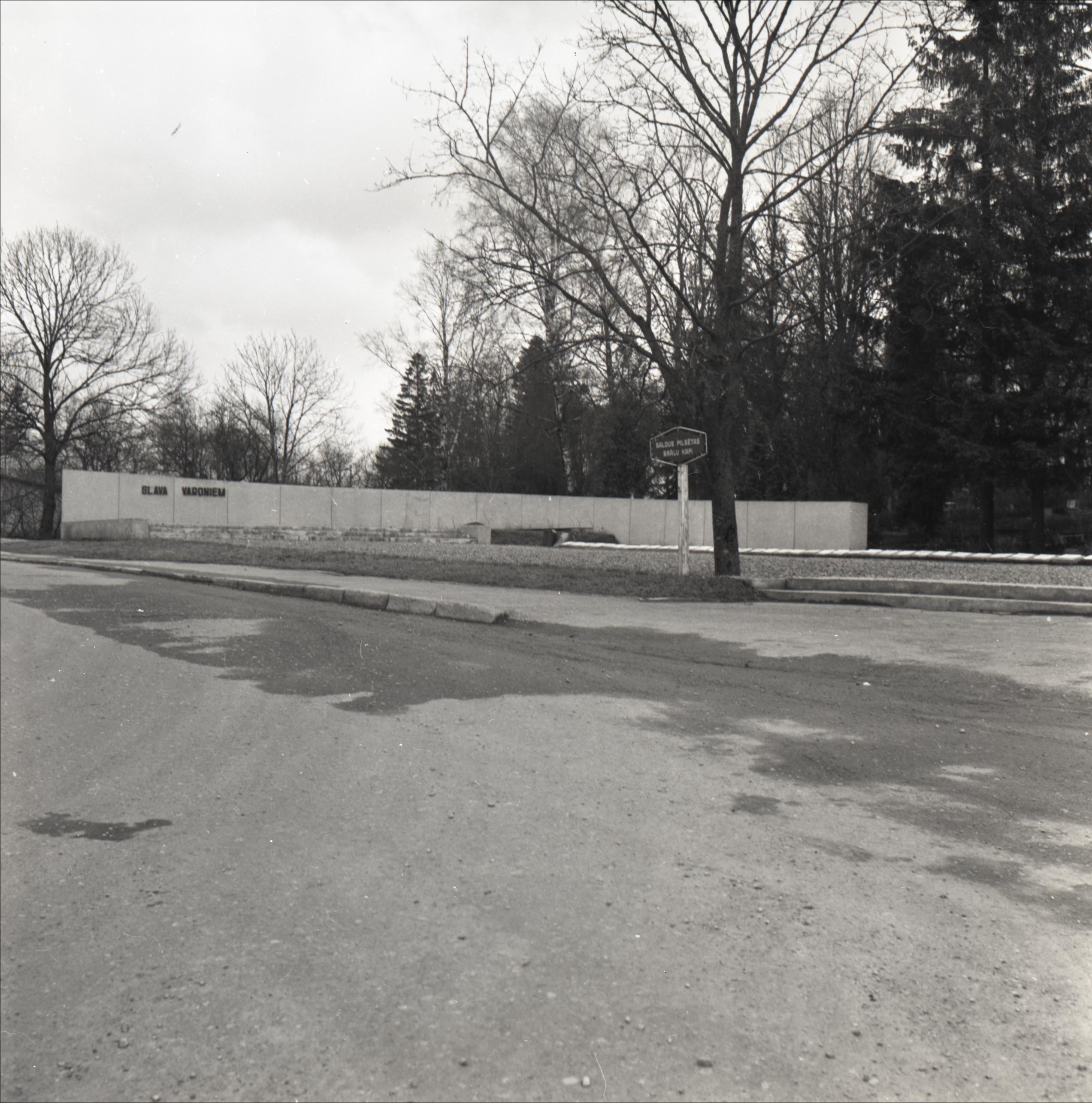Brāļu kapi: 2. pasaules kara brāļu kapi. Skats uz brāļu kapiem no otras ceļa puses. Priekšplānā ceļs. Redzama brāļu kapu betona siena ar uzrakstu "Slava varoņiem". Pie brāļu kapiem zīme ar uzrakstu "Saldus pilsētas brāļu kapi".