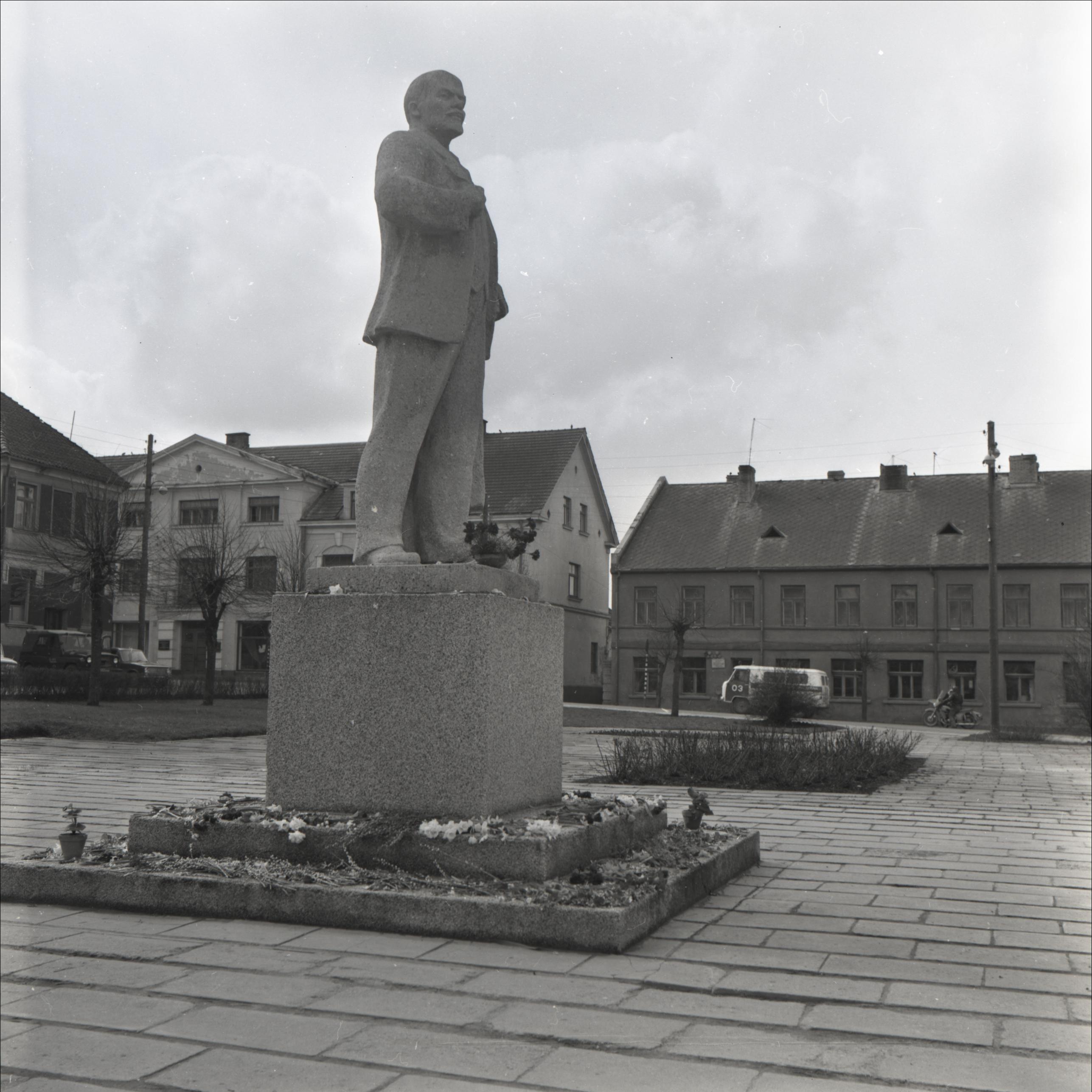 Ļeņina piemineklis: Pieminekļa kopskats. Figūra atrodas uz paaugstinājuma ar pakāpieniem lejasdaļā, uz pakāpieniem ziedi. Fonā redzamas ēkas, automašīnas un motocikls.
