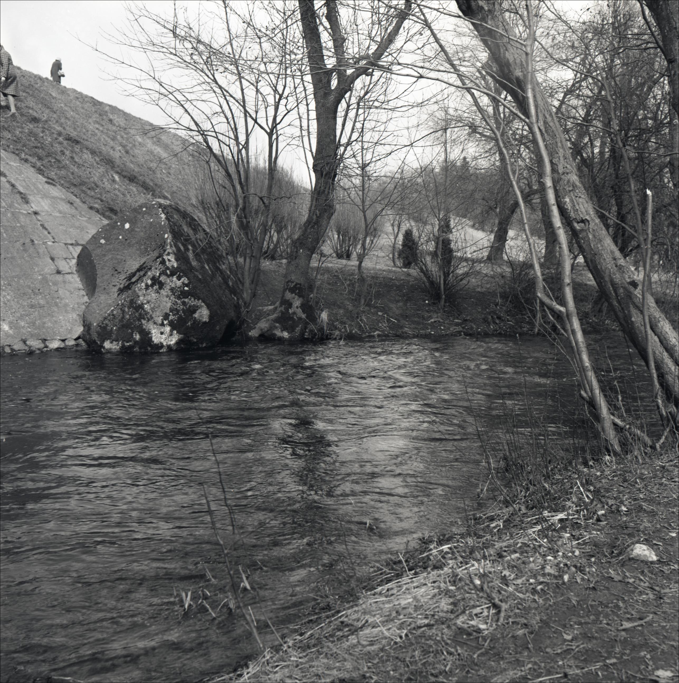 Rozentāla akmens: Skats uz akmeni no upes pretējā krasta. Akmens atrodas upes malā.