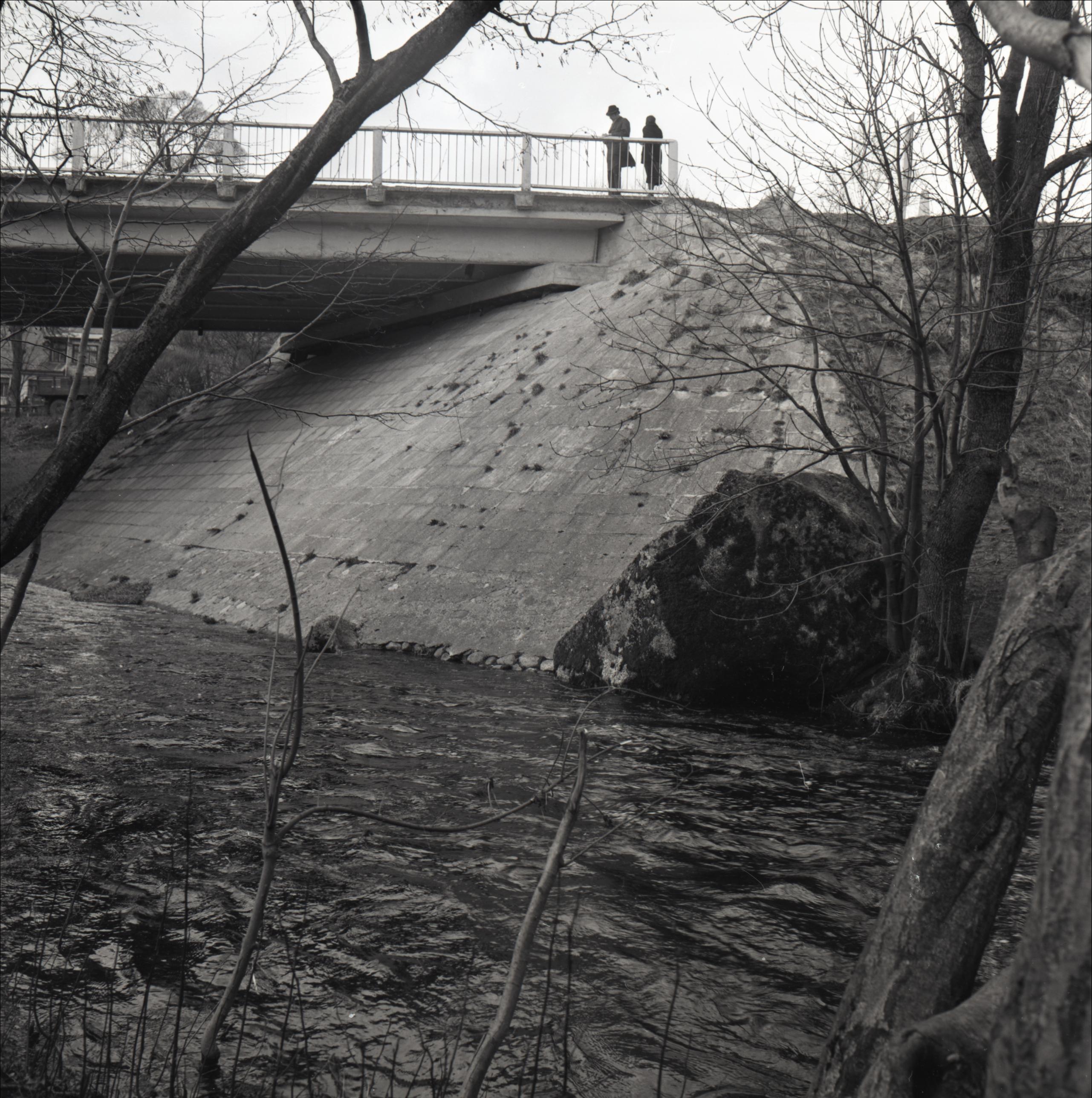 Rozentāla akmens: Skats uz akmeni no upes pretējā krasta, akmens atrodas upes malā pie tilta pāri upei. Uz tilta stāv cilvēki.