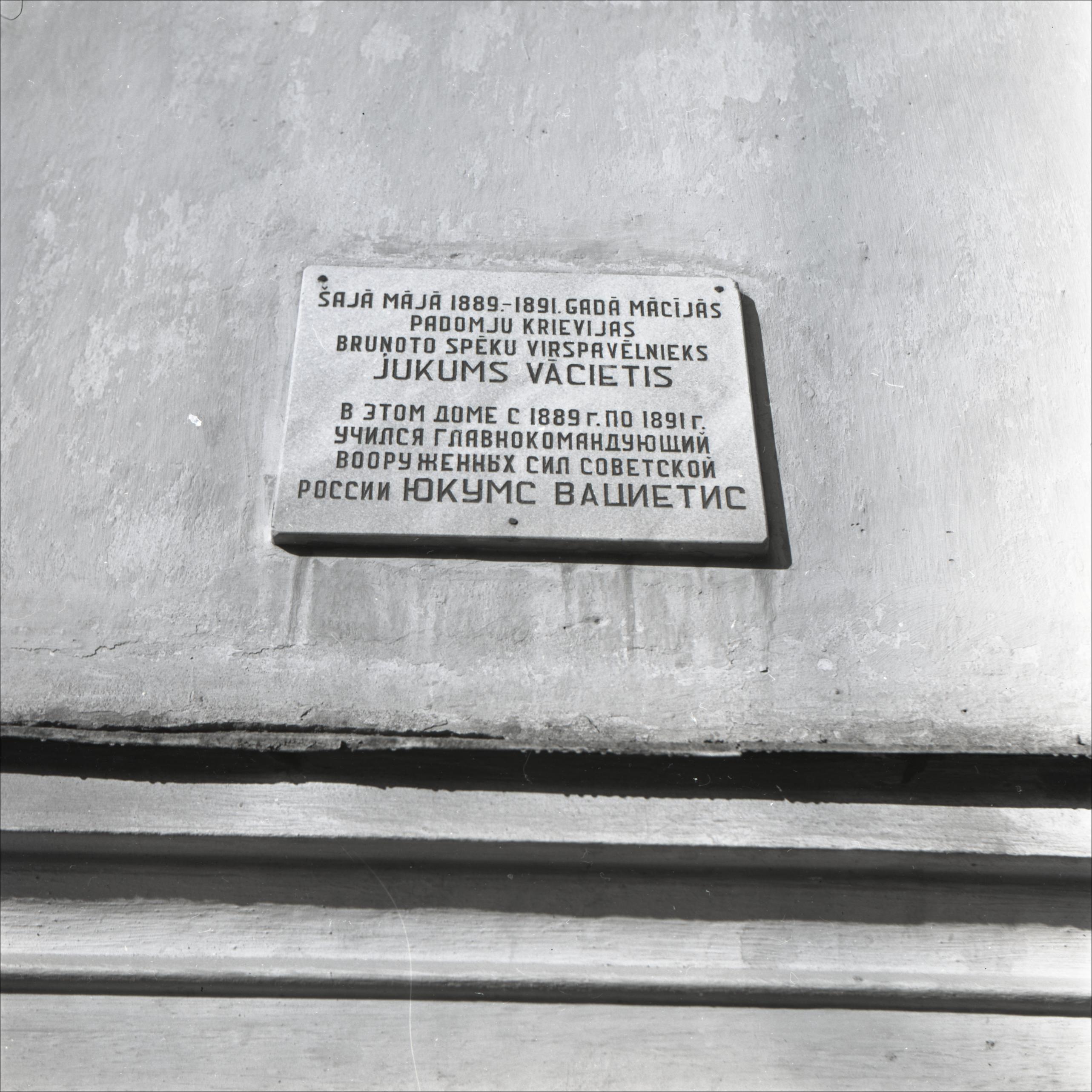 Ēka: Piemiņas plāksne Jukumam Vācietim. Plāksnes tuvplāns, uz tās uzraksti latviešu un krievu valodās.