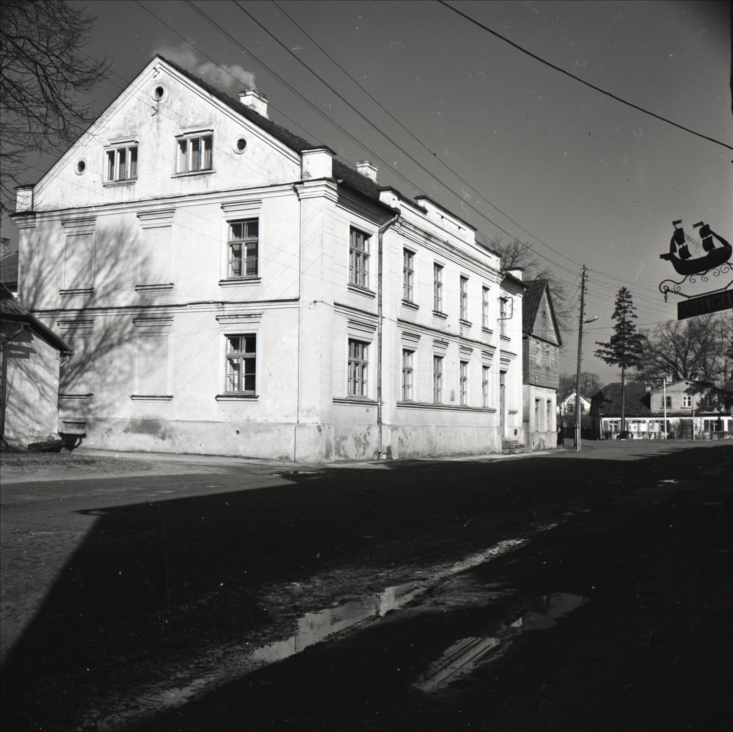 Ēka: Skats uz ēku no pretējās ielas puses. Redzama sānu un ielas fasāde. Ēkai divi stāvi un divslīpju jumts. Blakus ēkai citas ēkas.