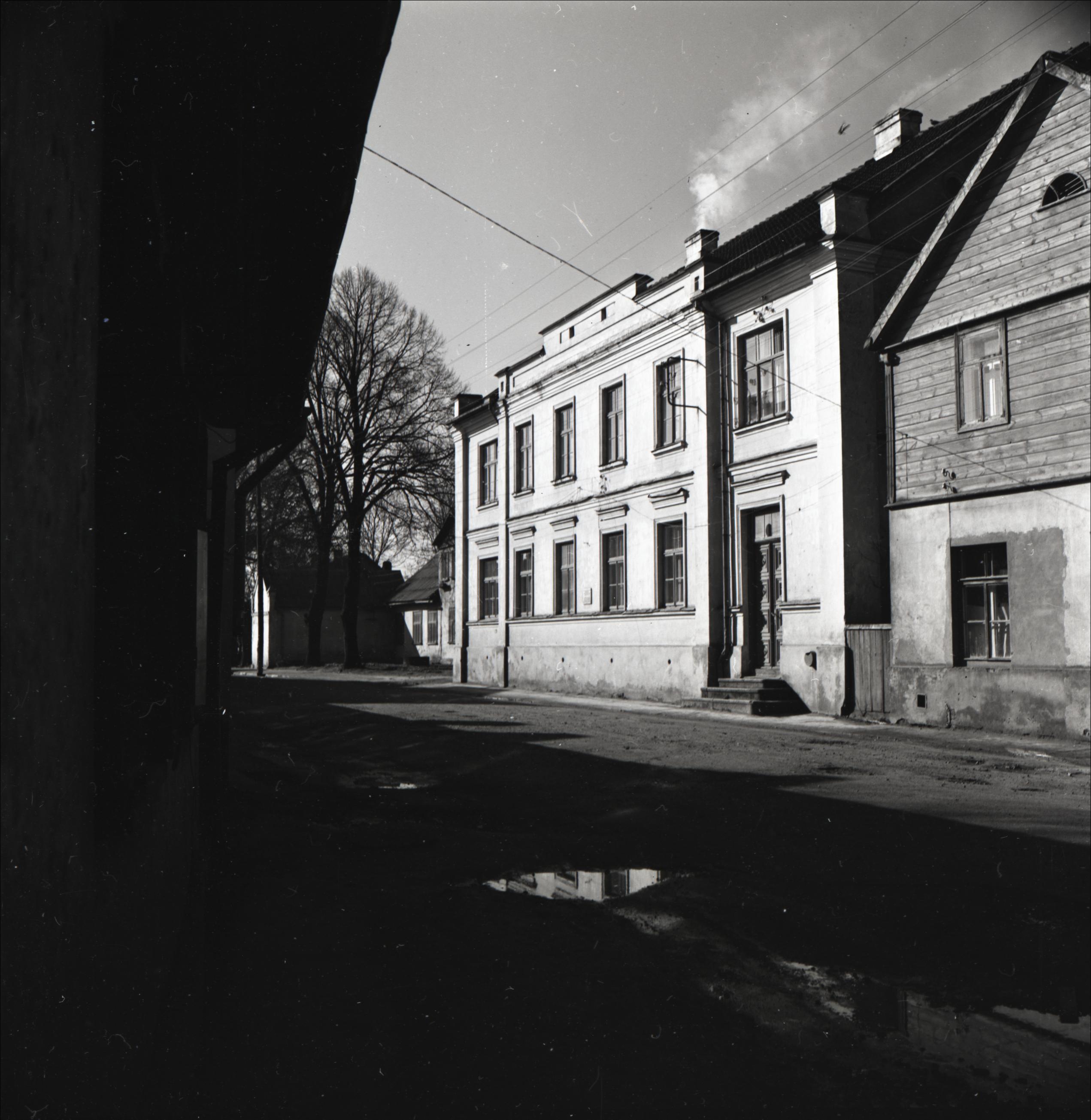 Ēka: Skats uz ēku no pretējās ielas puses. Redzama ielas fasāde. Ēkai divi stāvi. Blakus ēkai citas ēkas.