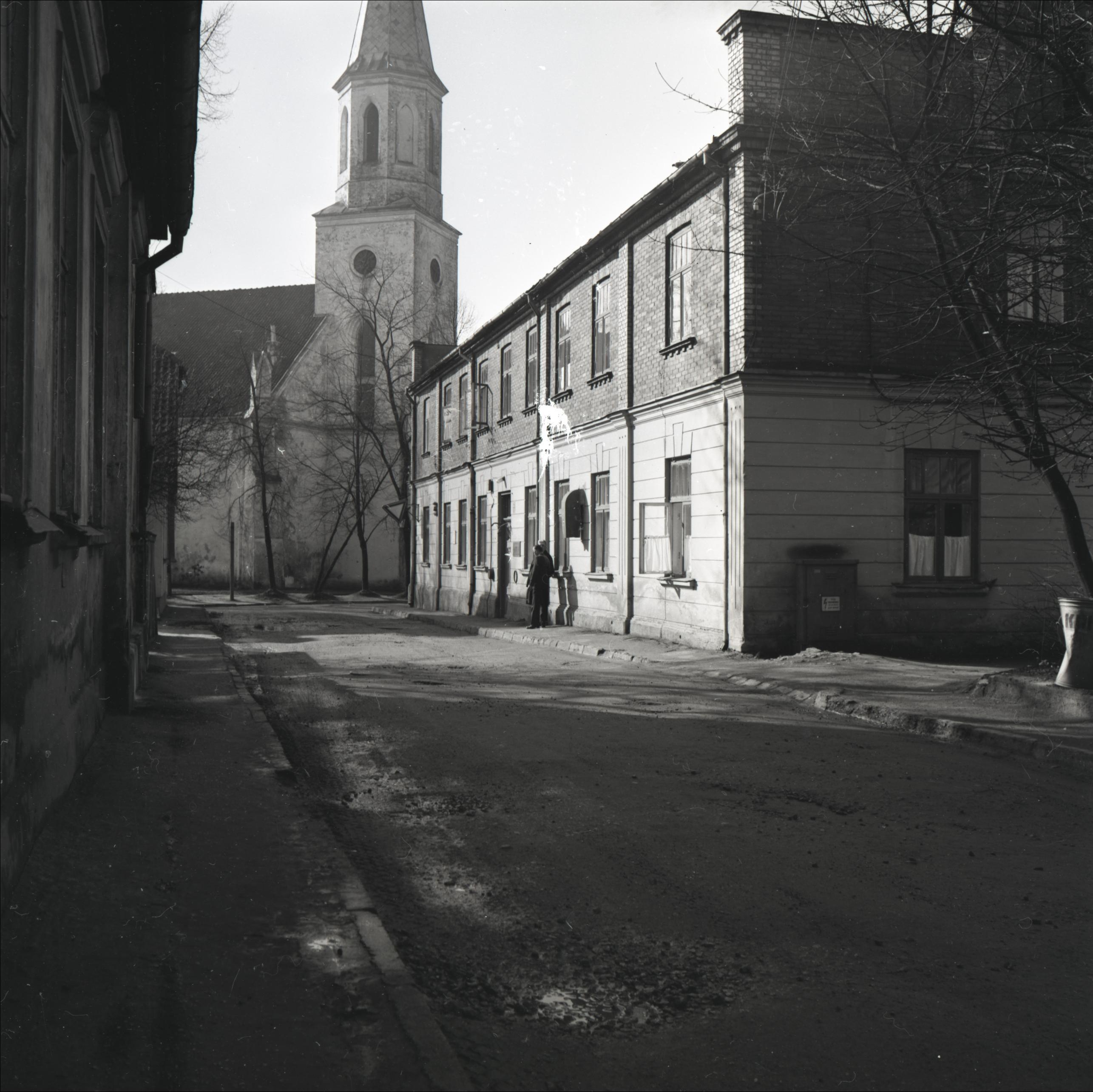 Ēka: Skats no ielas pretējās puses, redzamas ēkas ielas un sānu fasādes. Fonā redzama Kuldīgas Sv. Katrīnas luterāņu baznīca, pa ietvi iet civēki, attēla kreisajā pusē redzamas ēkas no pretējās ielas puses.