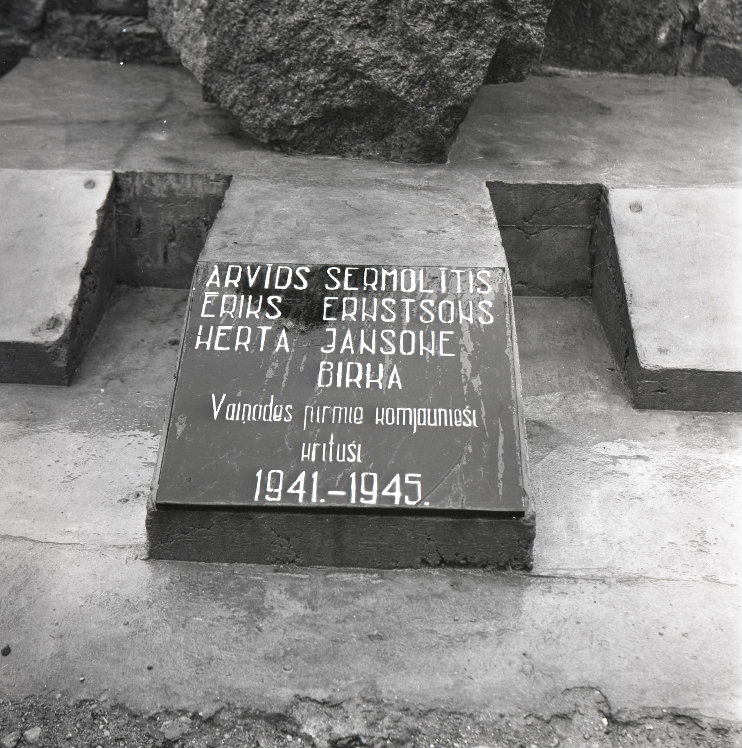 Piemiņas akmens: Piemiņas akmens pie vidusskolas. Plāksnes tuvplāns. "Vaiņodes pirmie komjaunieši krituši 1941.–1945."