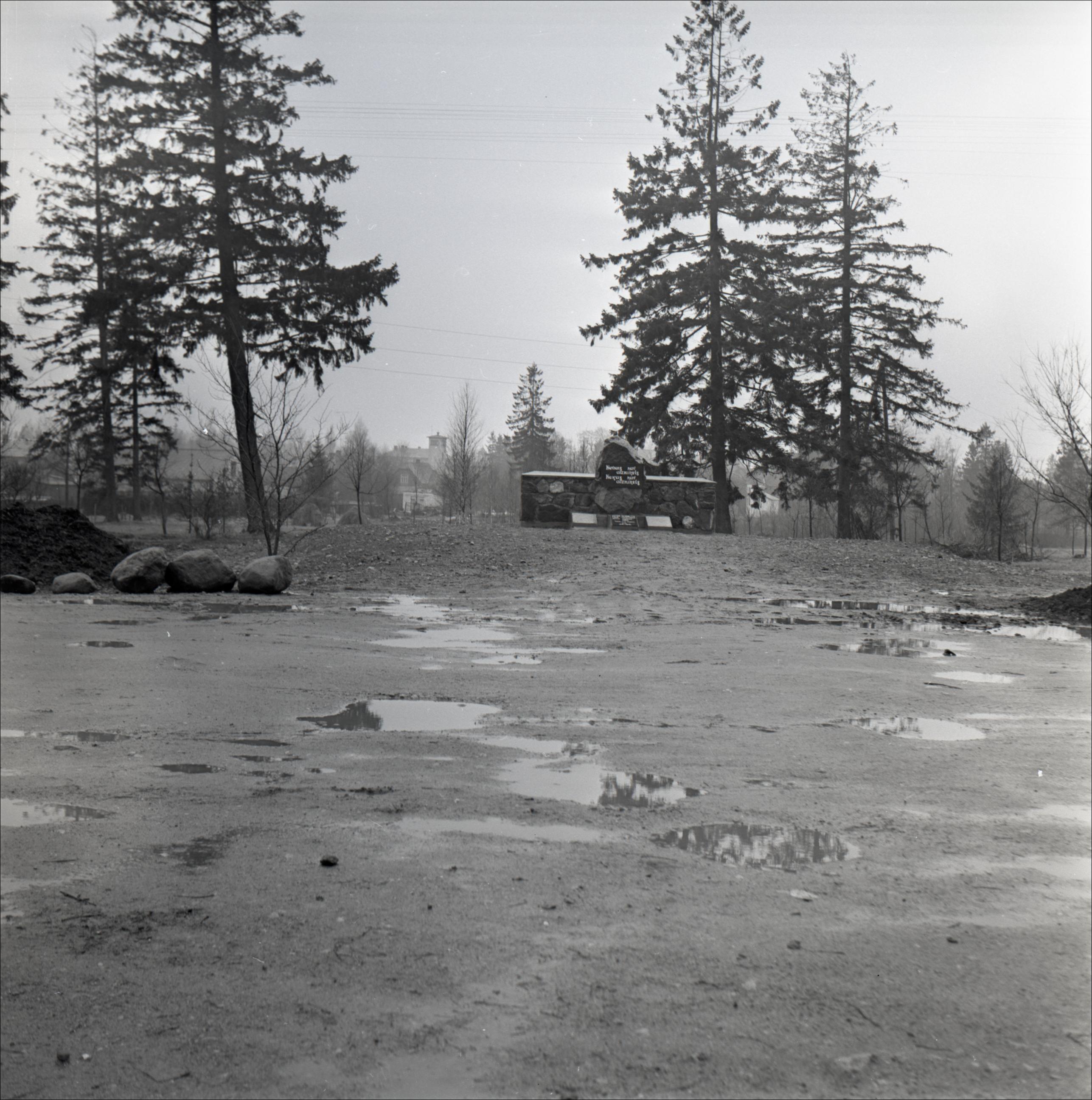 Piemiņas akmens: Piemiņas akmens pie vidusskolas. Skats uz piemiņas akmeni no attāluma. Priekšplānā ceļš, fonā koki.