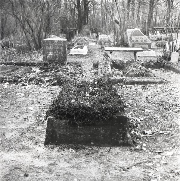 Vaiņodes kapsēta: Revolucionāra Miķeļa Bunkas kaps. Kapa vietas tuvplāns. Kaps ar apmali, uz apmales kritušā vārds un dzīves dati. Fonā citas kapa kopas un pieminekļi.