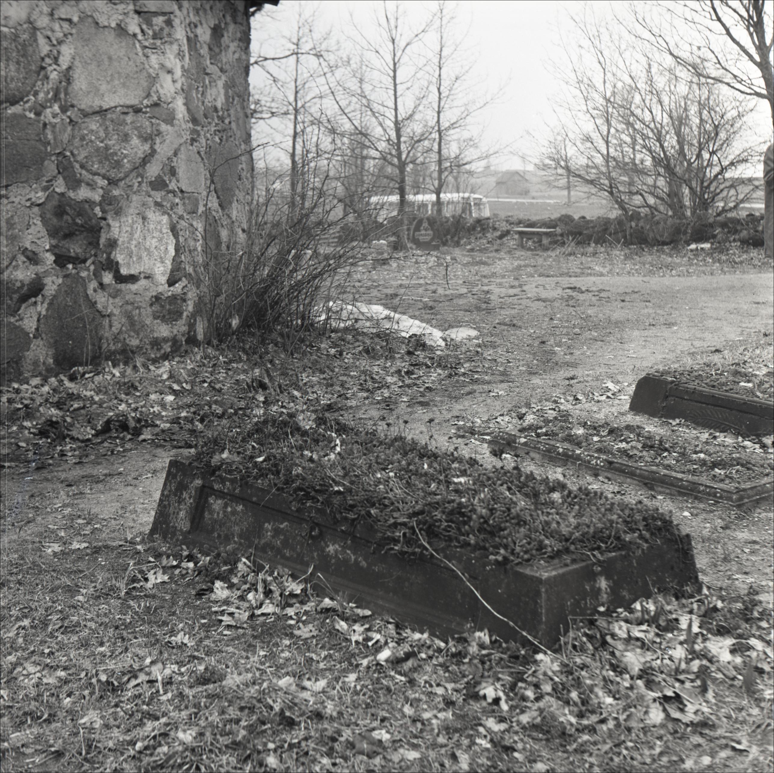 Vaiņodes kapsēta: Revolucionāra Miķeļa Bunkas kaps. Kapa vietas tuvplāns. Kaps ar apmali, balakus cita kapa kopas, blakus kapam ēka. Fonā redzams kapu mūra žogs un aiz tā busiņš.