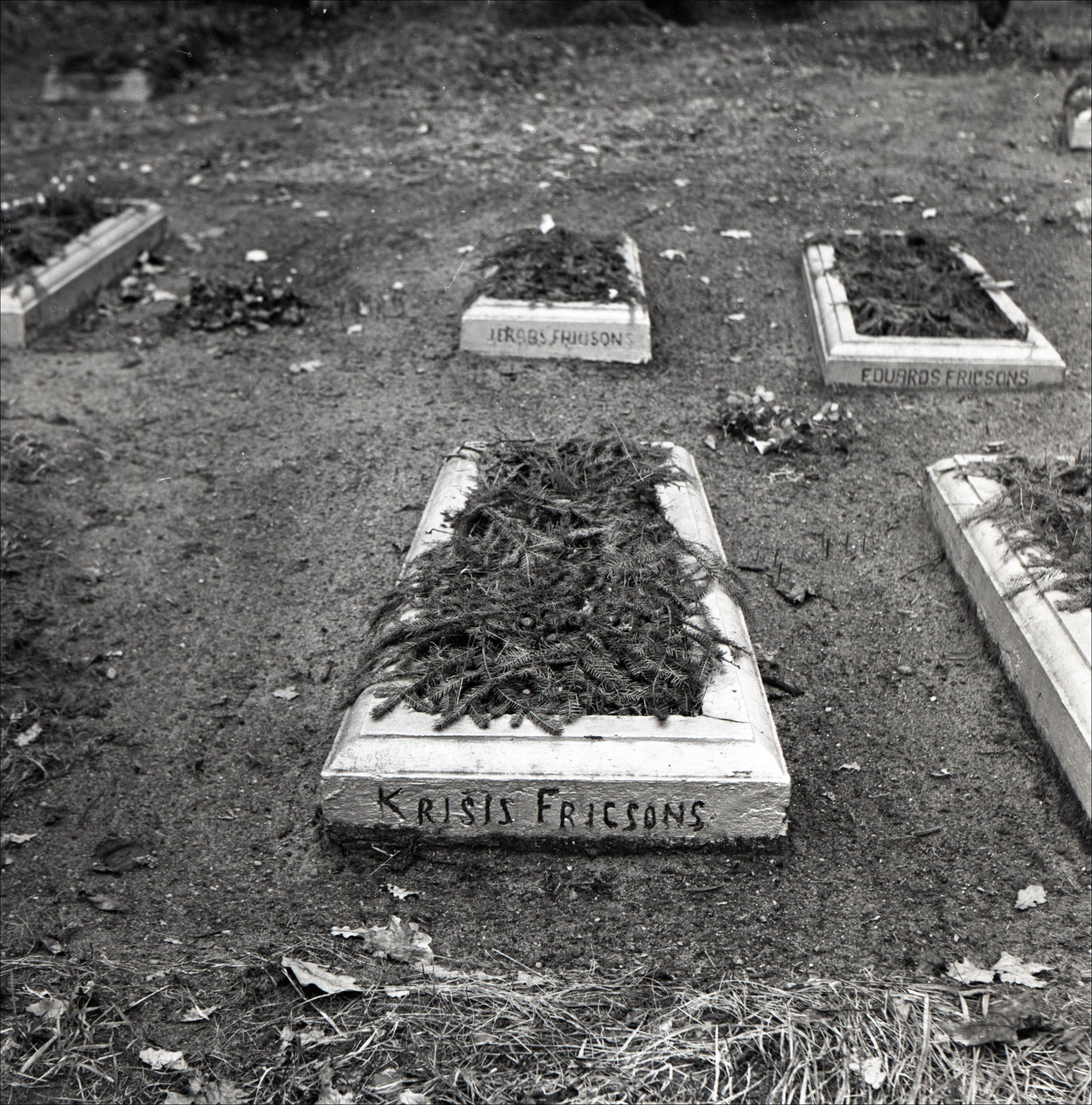 Vaiņodes kapsēta: Revolucionāra Kriša Fricsona kaps. Kapa vietas tuvplāns. Kapa vieta ar apmali, uz apmales kritušā vārds. Apkārt kapa vietai līdzīgas kapa vietas ar apmalēm un vārdiem uz tām.