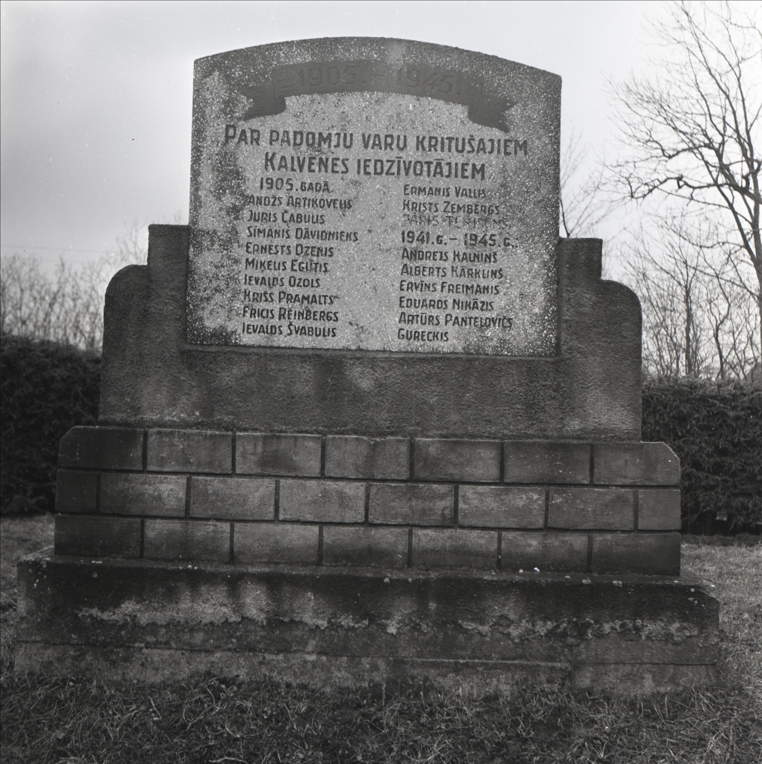 Piemiņas akmens: Piemiņas akmens 2. pasaules karā un revolūcijā kritušajiem Kalvenes ciema iedzīvotājiem. Pieminekļa tuvplāns. Uz pieminekļa personu vārdi, kas krituši revolūcijas un 2. pasaules kara laikā.