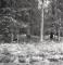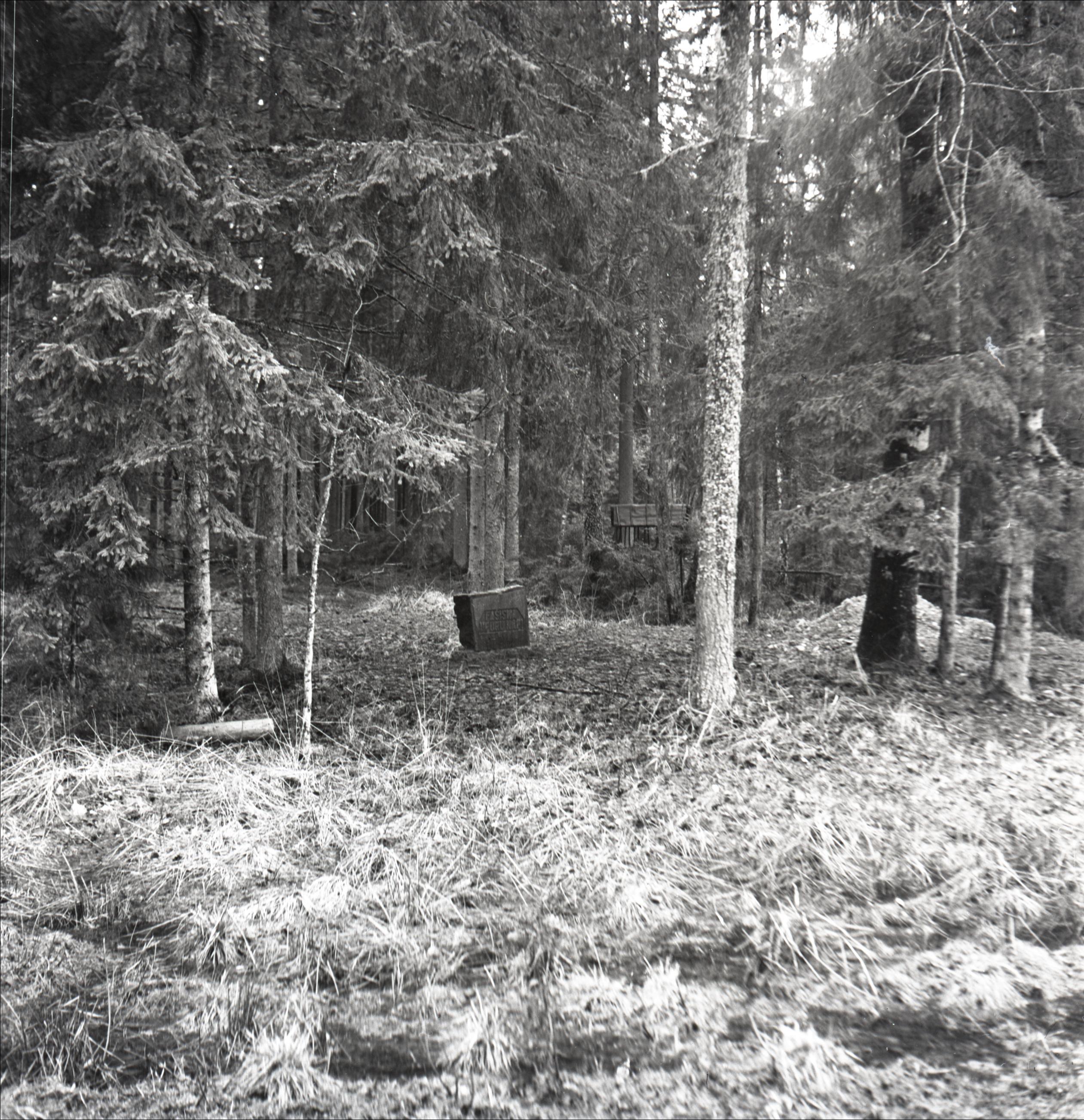 Nacistiskās Vācijas upuru kapi pie Kalvenes stacijas: Nacistiskās Vācijas upuru kapi pie Kalvenes stacijas. Skats uz pieminekli no attāluma, piemineklis atrodas starp kokiem.