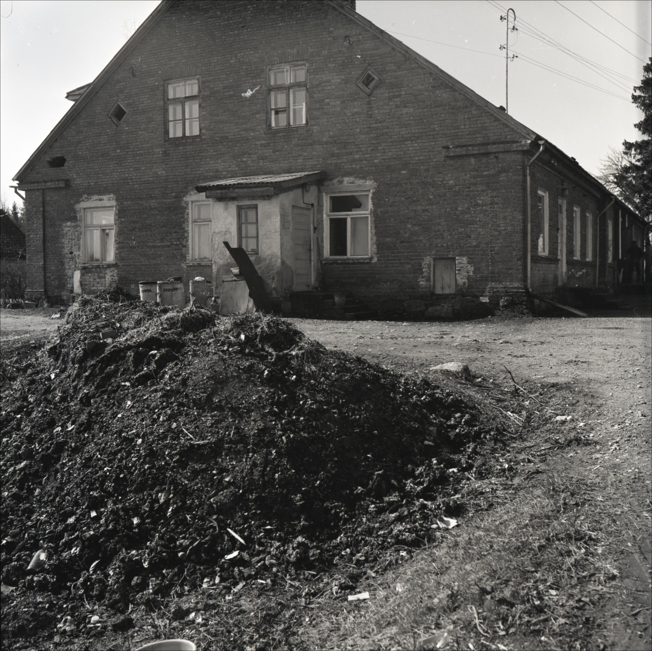 Ēka: Graudupes skola - ēka, kurā mācījies Ernests Vīgners. Skats uz ēkas sānu fasādi. Pie fasādes neliela piebūve - lievenis. Priekšplānā zemes kaudze.