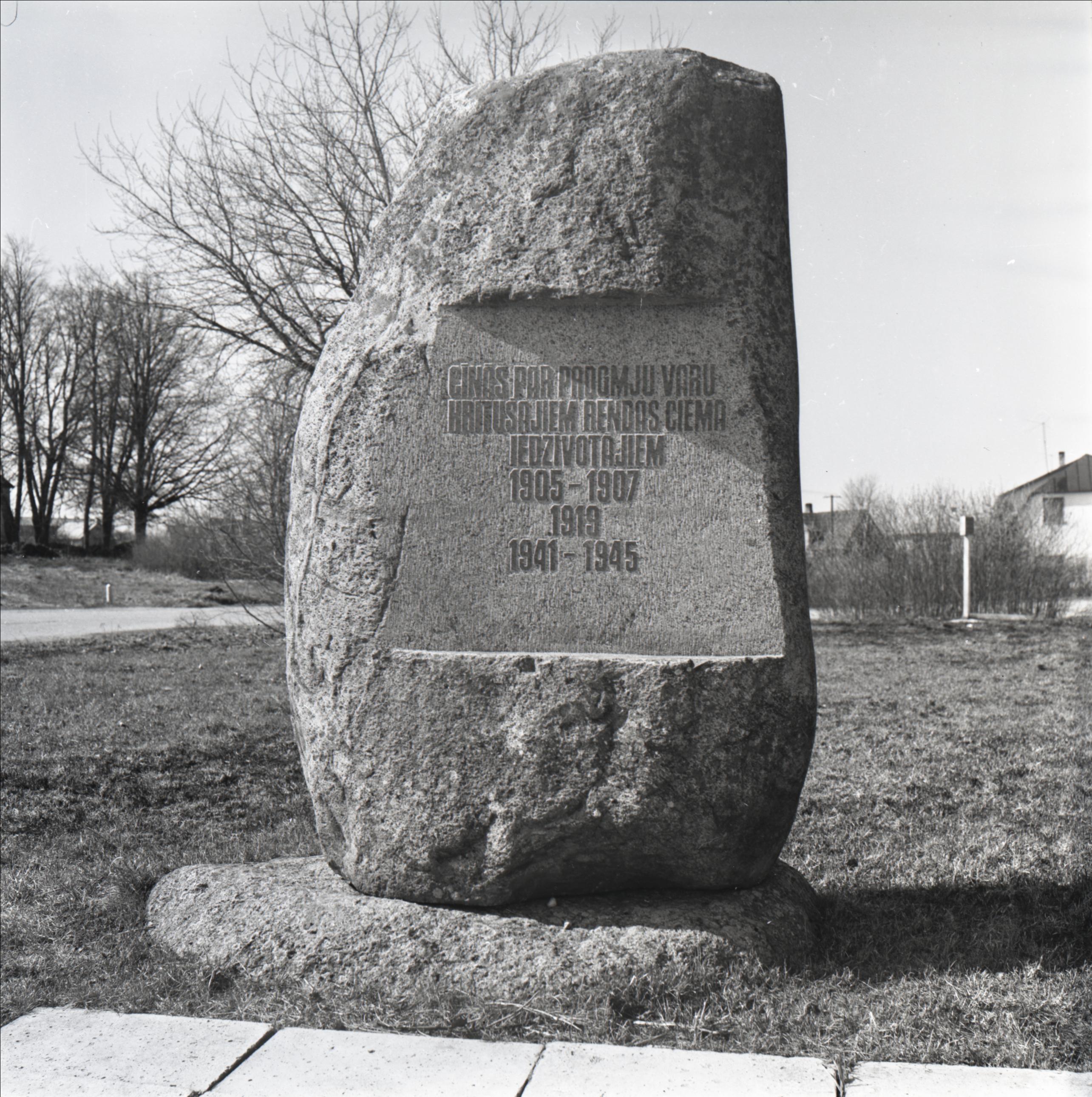 Piemiņas akmens: Piemiņas akmens revolūcijā, 1. pasaules un 2. pasaules karā kritušajiem Rendas iedzīvotājiem. Akmens tuvplāns. Fonā redzamas ēkas.