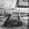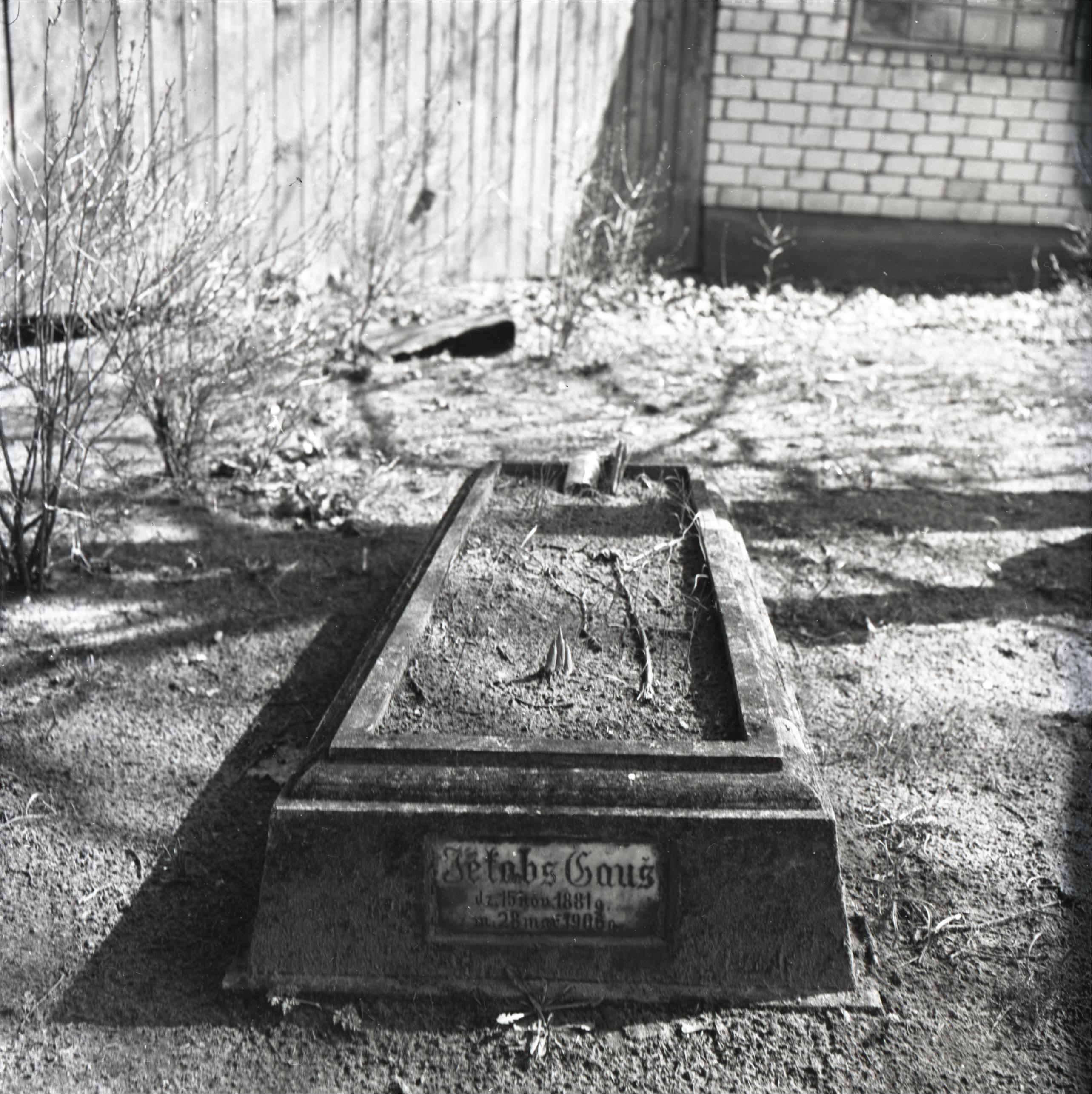 Dziedātāju kapi: Revolucionāra Jēkaba Gauša kaps. Kapa tuvplāns. Kaps ar apmali, uz apmels plāksne ar kritušā vārdu un dzīves datiem. Fonā daļēji redzama ēka.