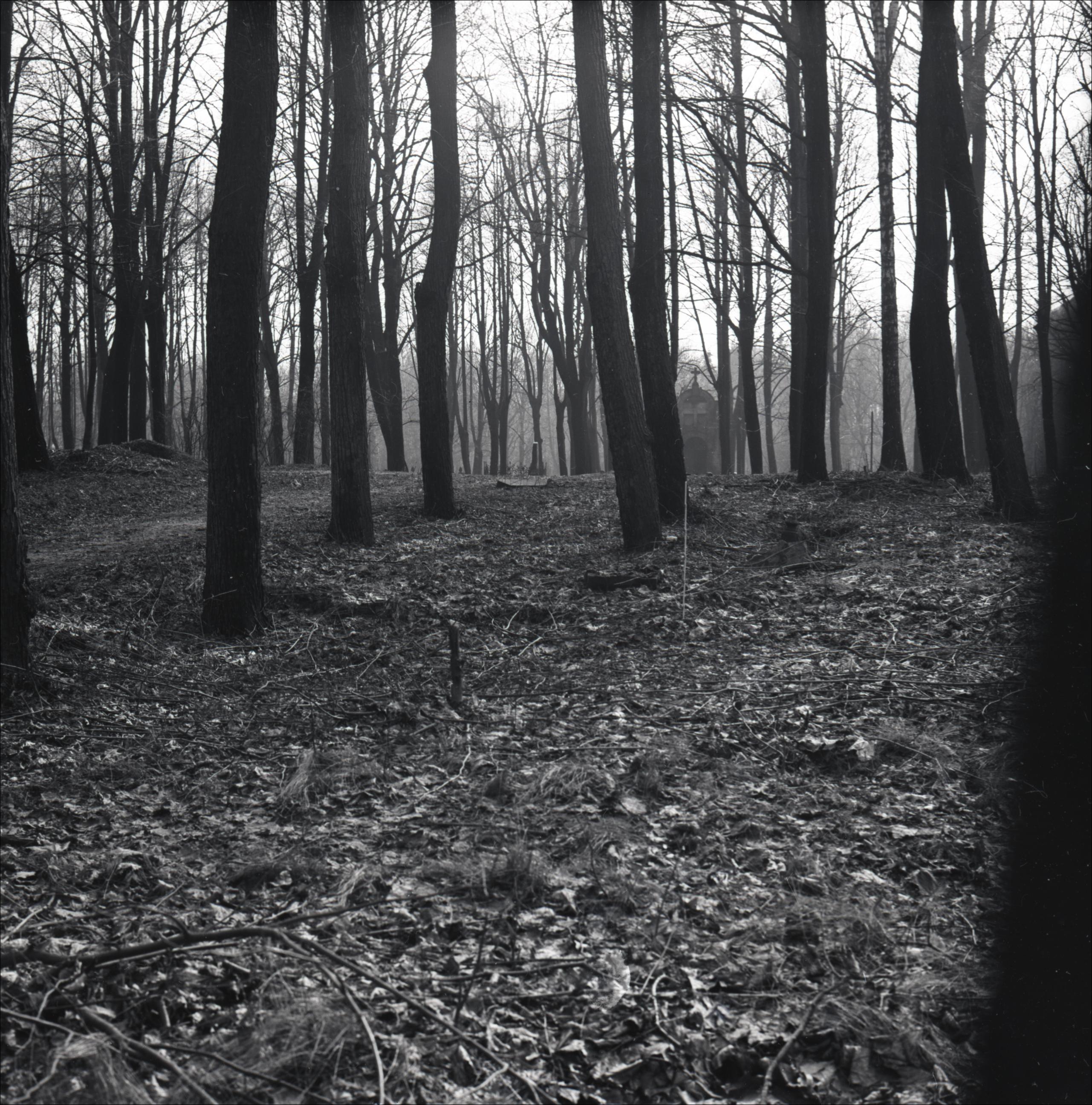 Lielie kapi: Grosvalda kapa vieta (nav īstā). Skats lielajos kapos. Kapa vieta nav atzīmēta. Tālumā redzama kapliča un citas kapa vietas.