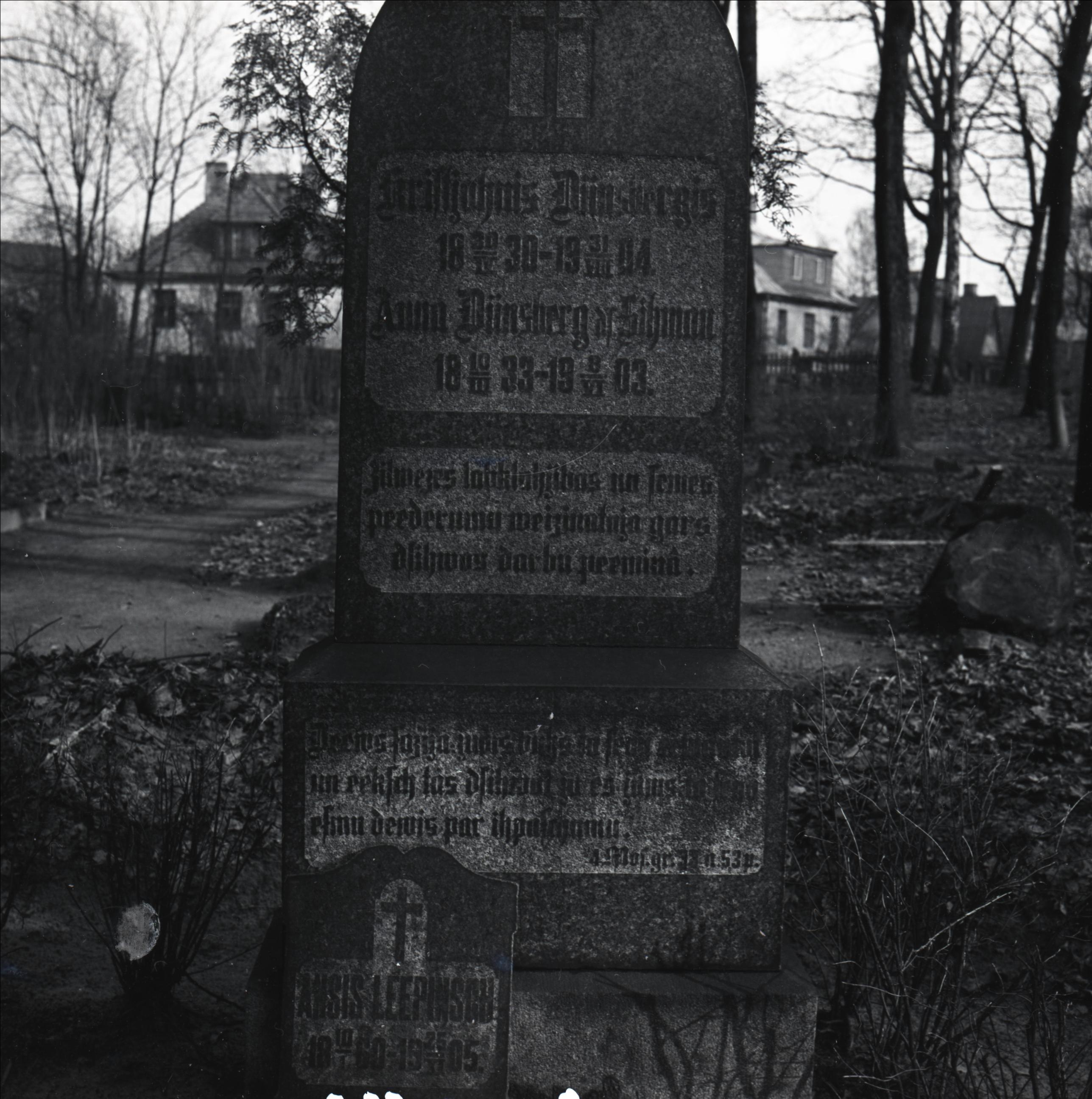 Lielie kapi: Dinsberģa kaps. Kapa pieminekļa tuvplāns. Pie kapa pieminekļa atstutēta plāksne Ansim Liepiņam. Fonā redzamas ēkas.