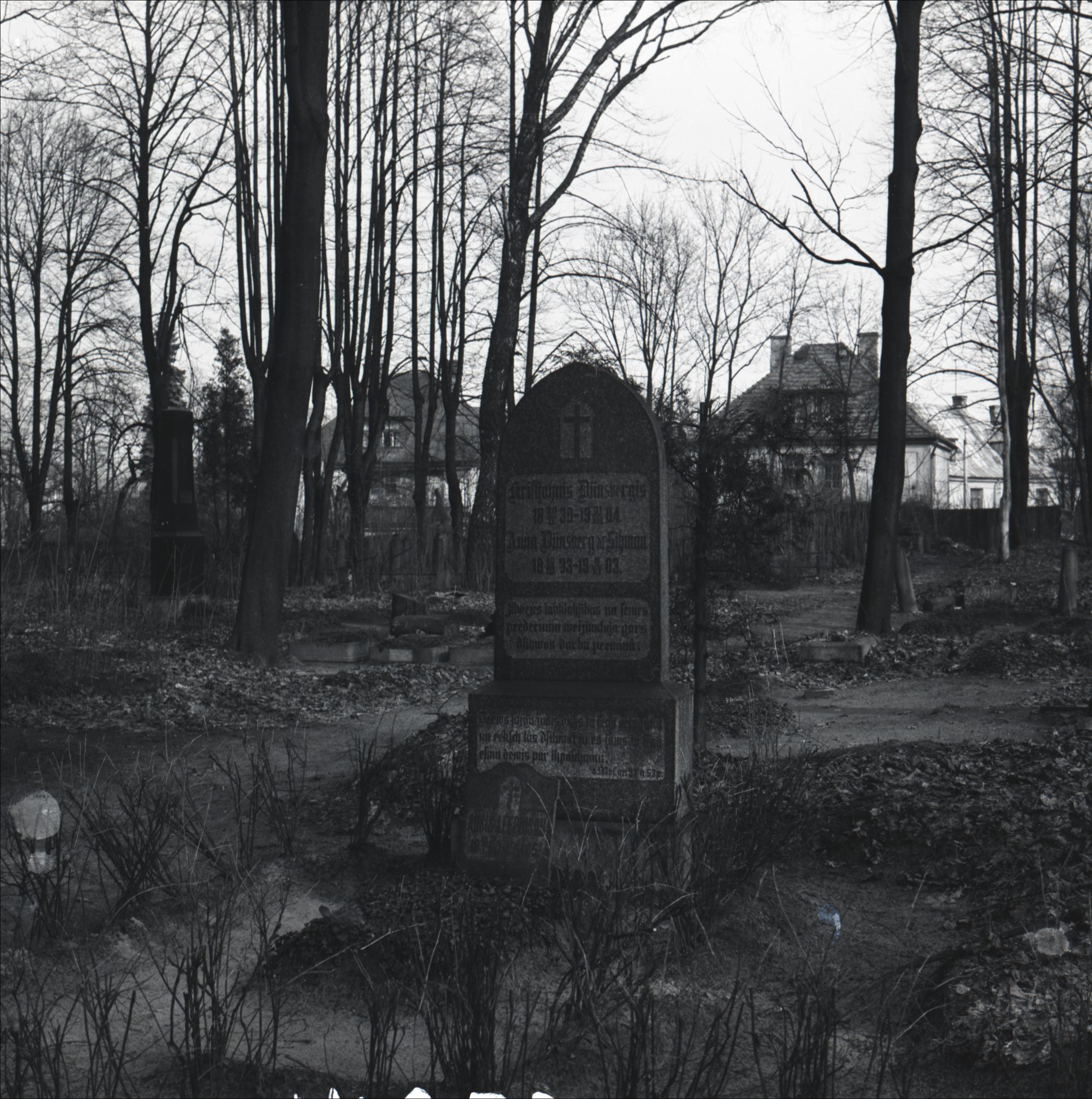 Lielie kapi: Dinsberģa kaps. Kapa pieminekļa kopskats. Pie kapa pieminekļa atstutēta plāksne Ansim Liepiņam. Fonā redzamas ēkas un citi kapi un pieminekļi.