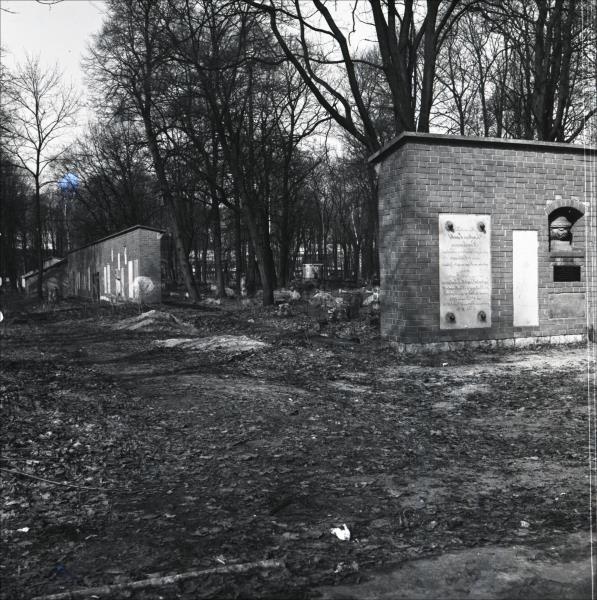 Lielie kapi: Siena ar iemūrētām kapu plāksnēm un pieminekļiem. Attēlā redzamas divas sienas ar kapu plāksnēm. Tālumā redzamas kapa vietas, pieminekļi un kapliča.