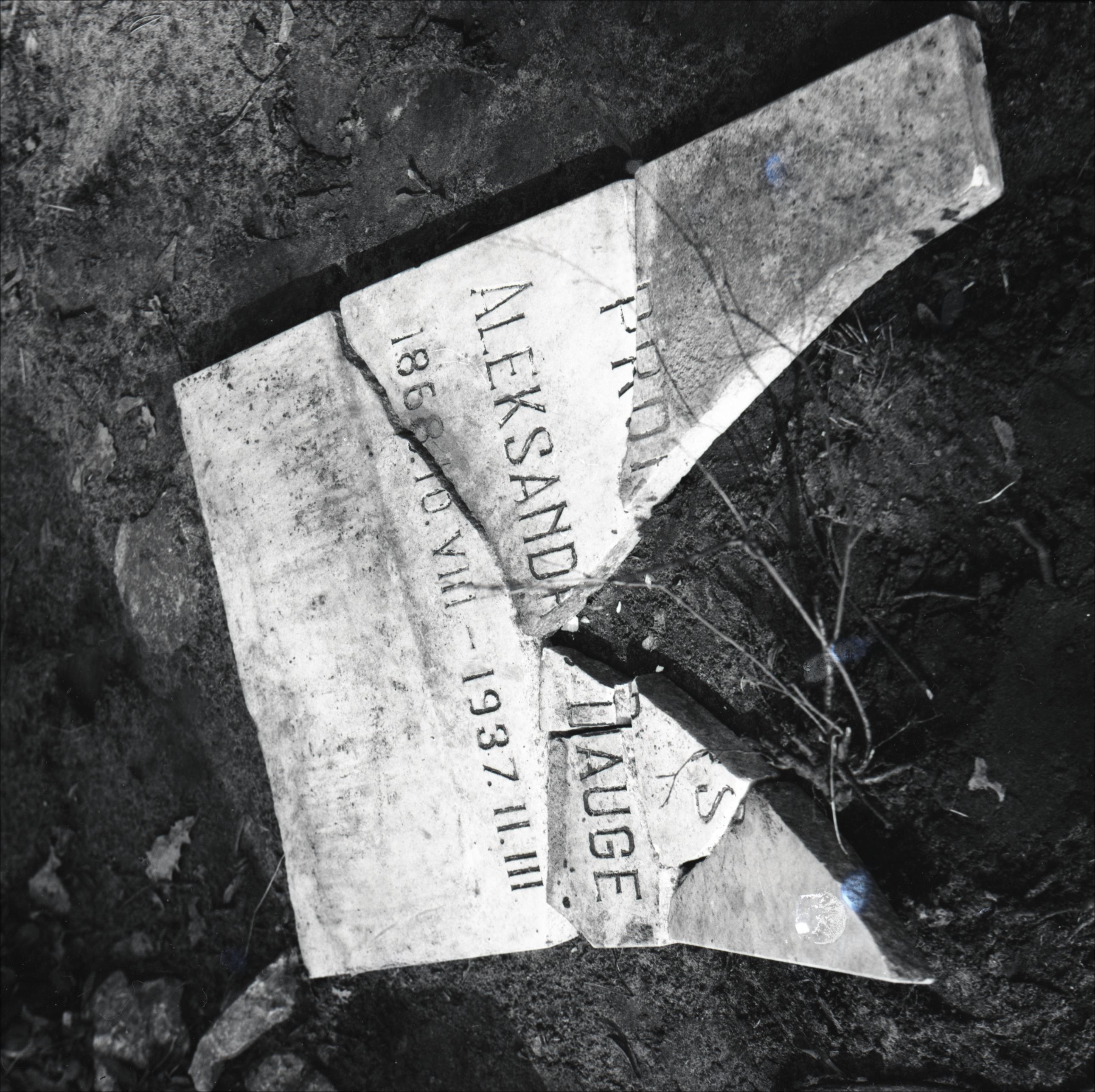 Lielie kapi: Aleksandra Dauges kaps. Kapa pieminekļa plāksnes tuvplāns. Plāksne saplēsta, daļas no plāksnes iztrūkst.
