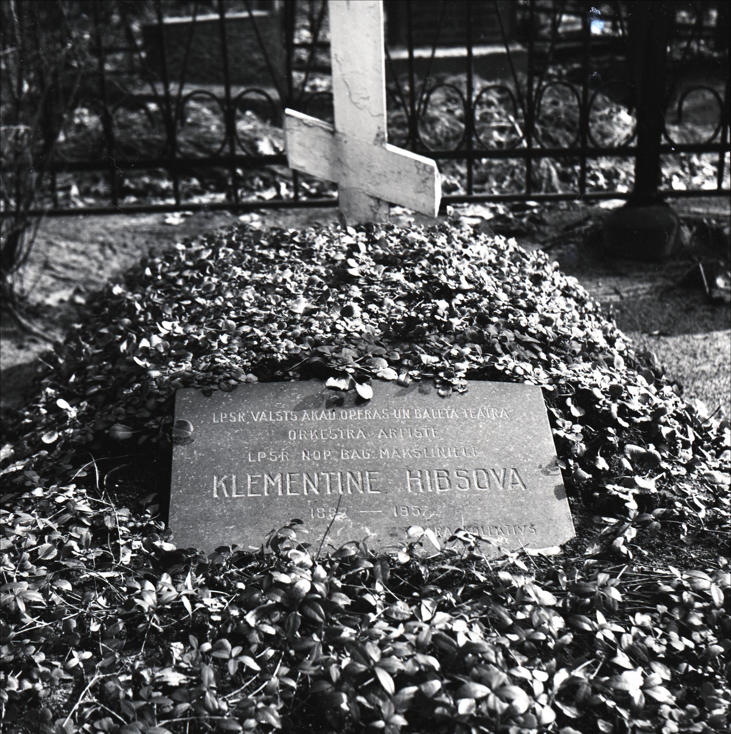 Pokrova kapi: Klementīnes Hibsovas kaps. Kapa vietas un plāksnes tuvplāns. Uz kapa kopas atrodas kapa plāksne, kapa galā pareizticīgo krusts. Fonā redzams metāla žogs.