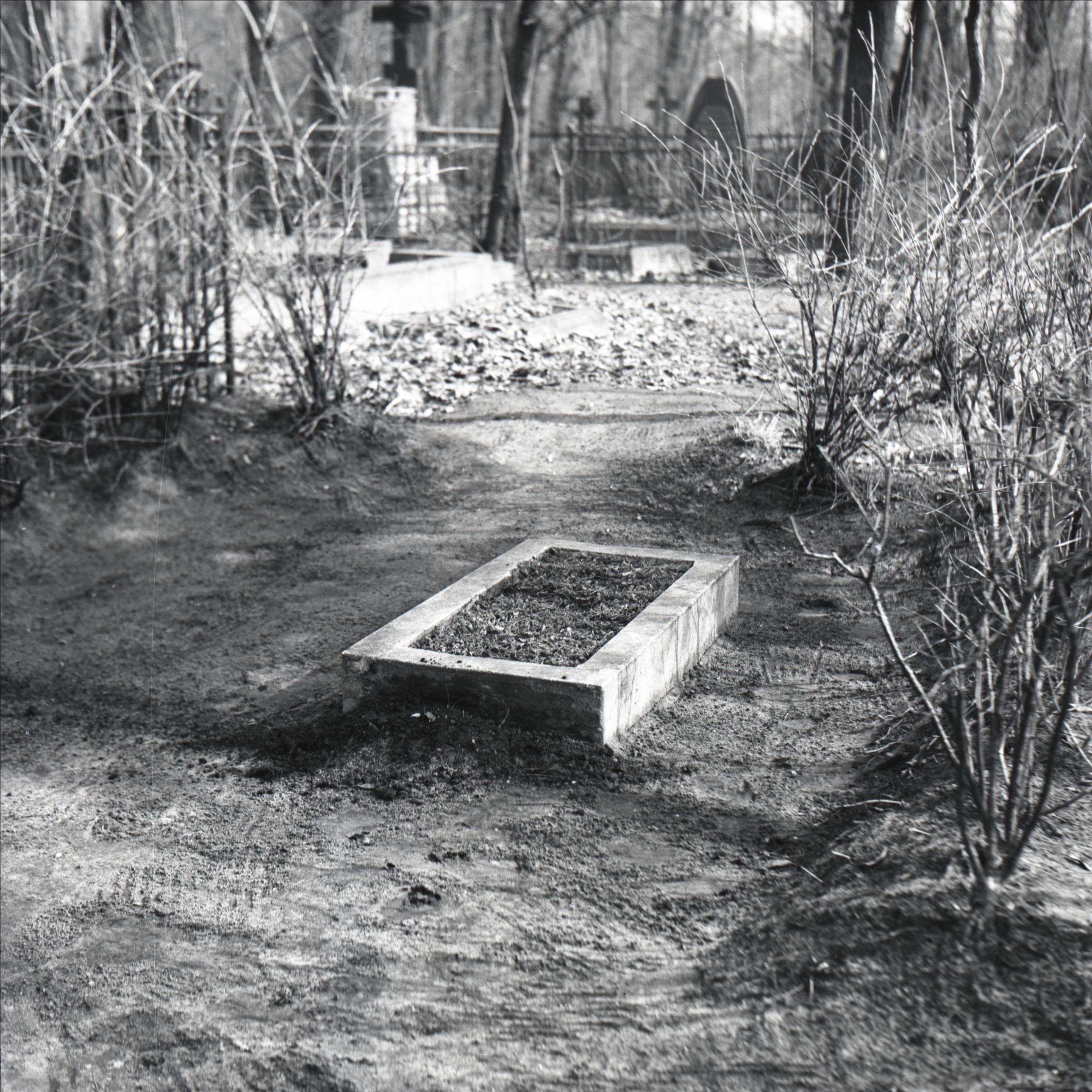 Pokrova kapi: Vinogradova kaps. Kapa vietas tuvplāns. Kapa vieta ar apmali, bez pieminekļa. Apkārt dzīvžoga krūmi. Fonā citas kapa vietas un pieminekļi.