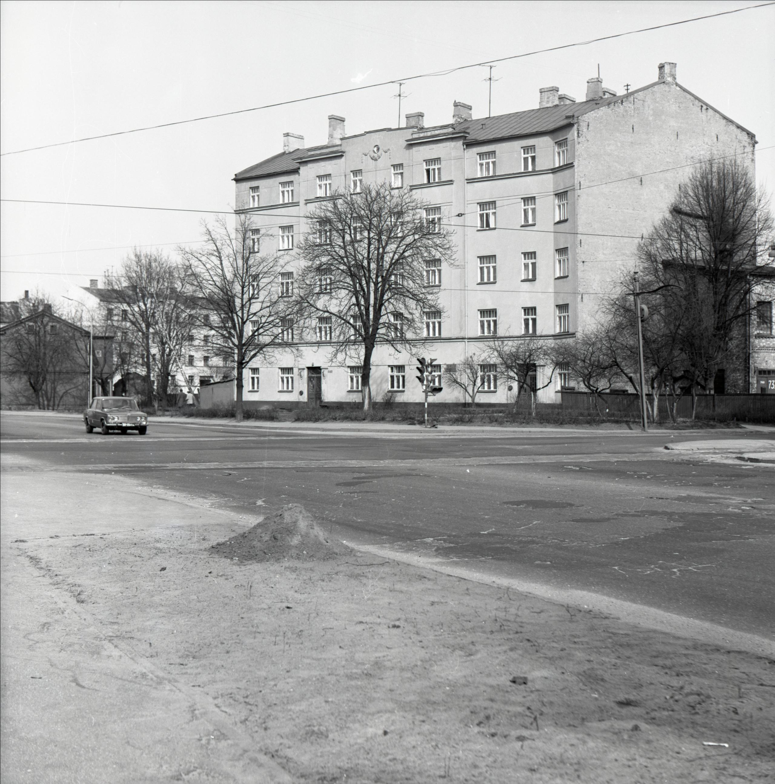 Ēka: Ēkas kopskats. Skats uz ēku no krustojuma otras puses. Uz ceļa automašīna. Fonā redzamas citas ēkas.