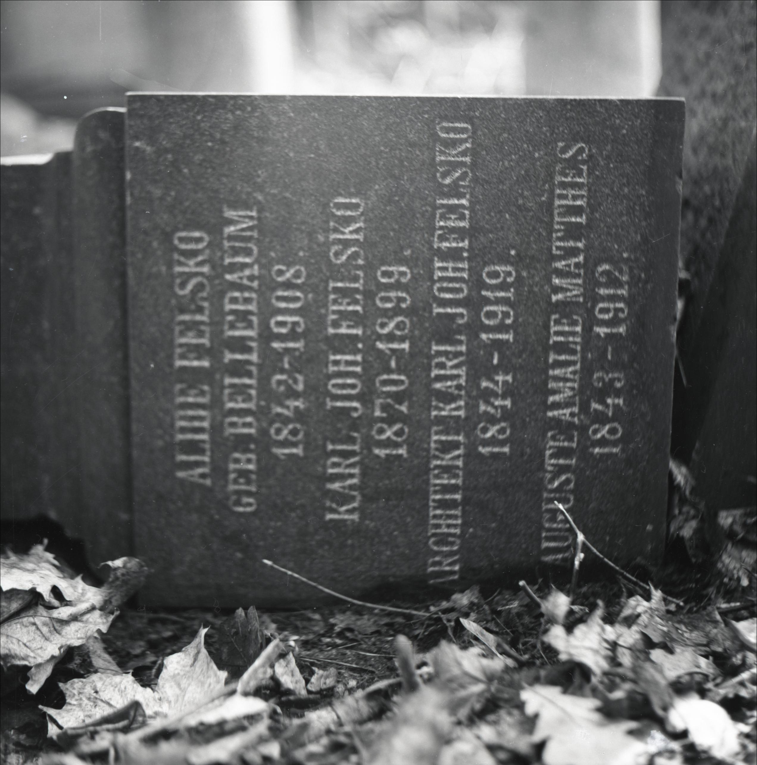 Lielie kapi: Arhitektu J. D. Felsko un K. J. Felsko kapi. Kapa pieminekļa lejasdaļas tuvplāns. Lejadaļā iegravēti Felsko ģimenes locekļu dzīves dati.