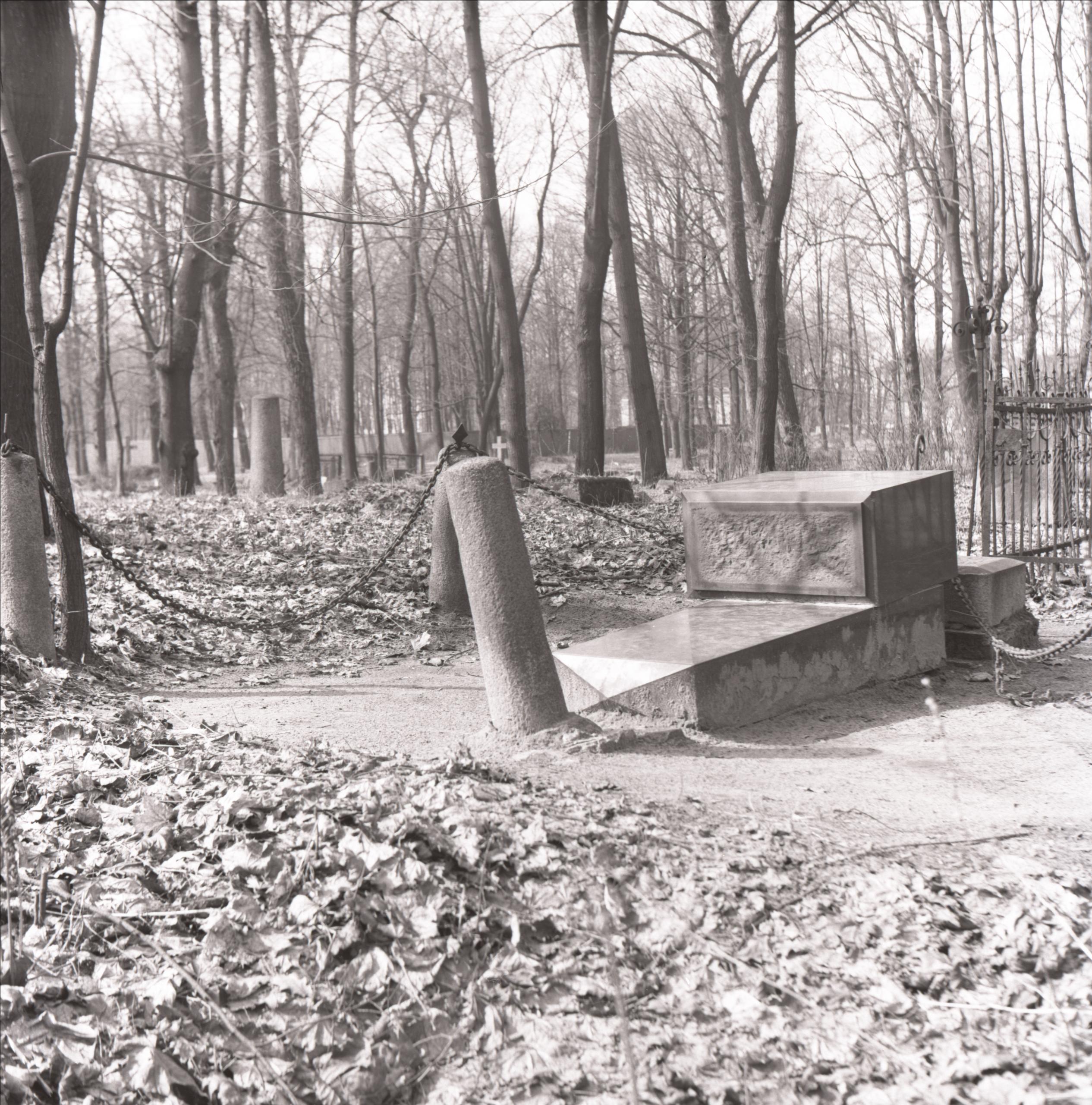 Lielie kapi: Kapa vietas tuvplāns. Kapa piemineklis apgāzts, no pamatnes atlūzis obelisks. Apkārt kapa vietai akmens stabi. Aiz kapa vietas metāla žogs. Fonā citas kapa vietas un pieminekļi, tālumā redzams žogs.