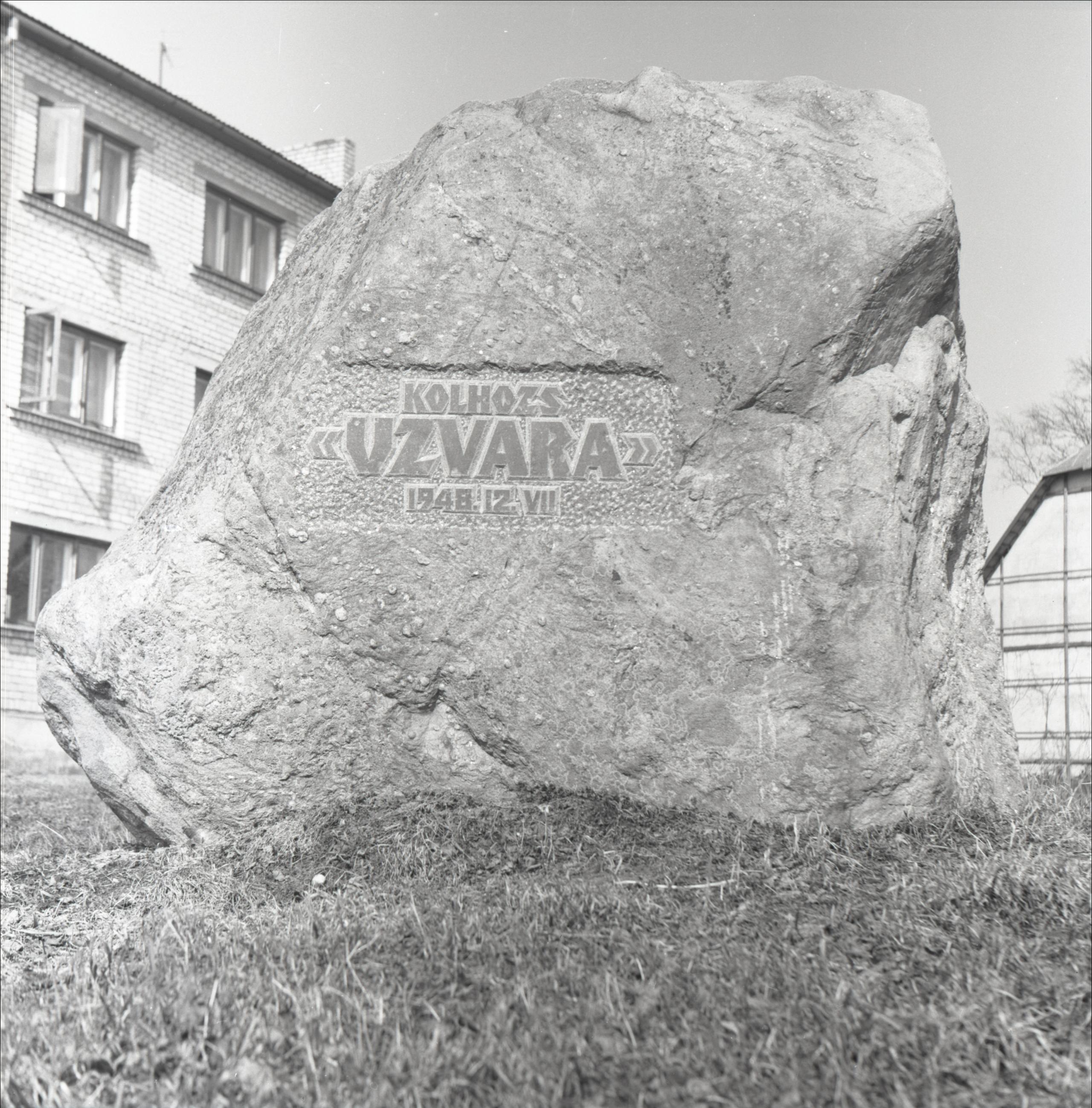 Piemiņas akmens: Piemiņas akmens pie kolhoza "Uzvara" kantora. Piemiņas akmens tuvplāns. Fonā redzamas ēkas.