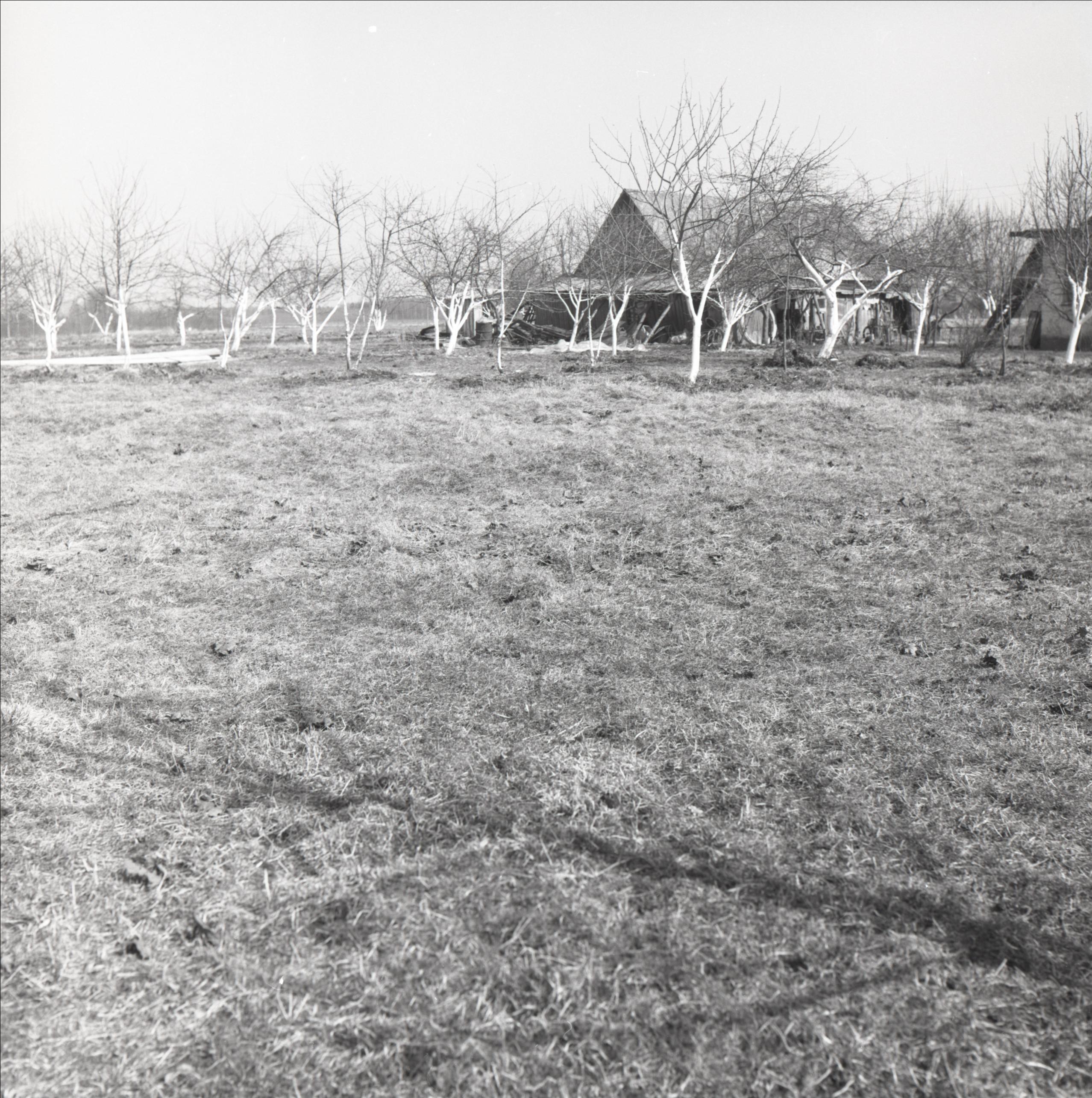 1. pasaules karā kritušo krievu karavīru kapi: Kapu vietas nav atzīmētas. Fonā redzams ābeļdārzs un ēkas.