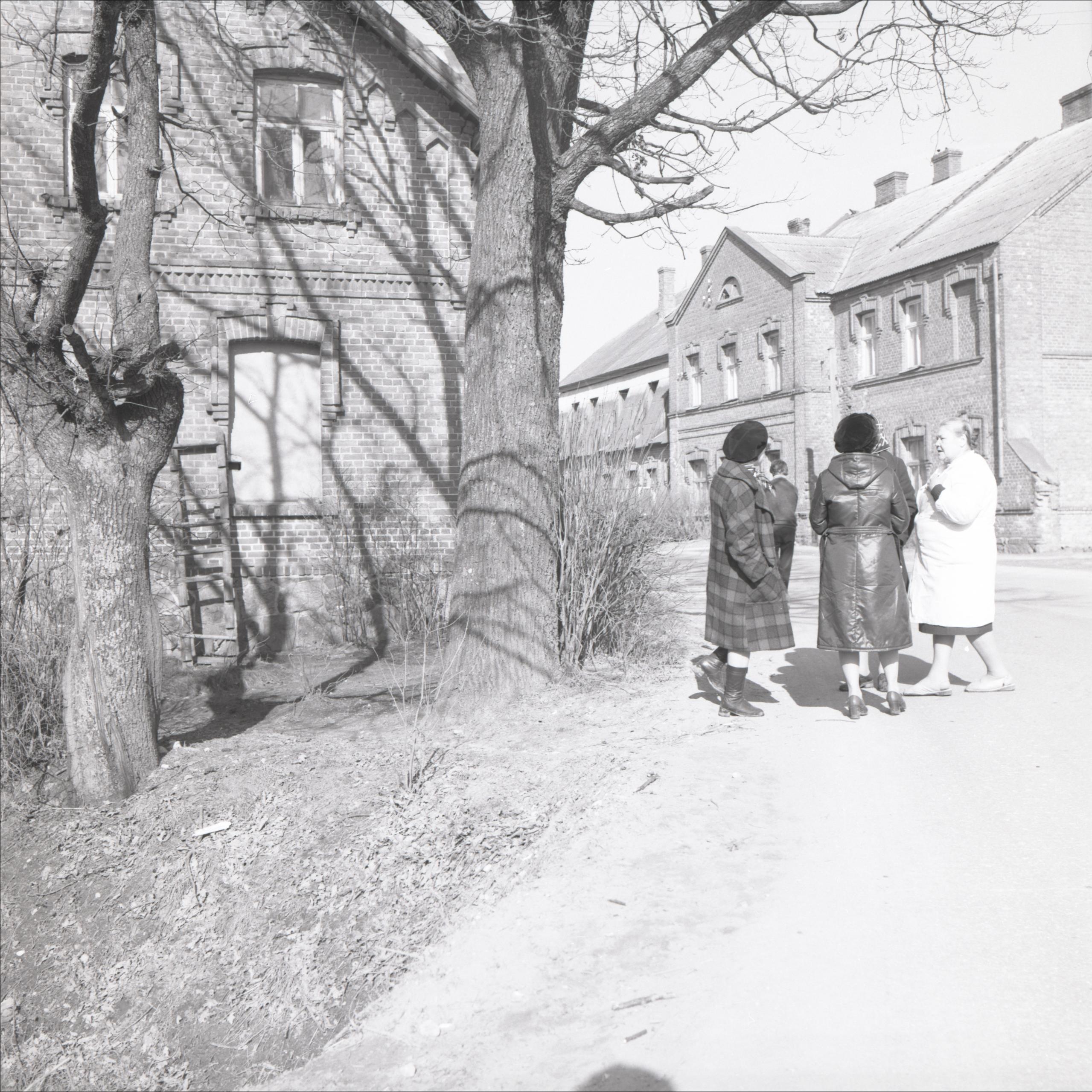 Ēka: Vieta, kur nošauti 1905. gada revolucionāri pie "Staburaga" mājām. Attēla kreisajā pusē redzama māja "Staburags". Fonā redzama divstāvu ēka pretējā ielas pusē. Uz ielas stāv cilvēki.