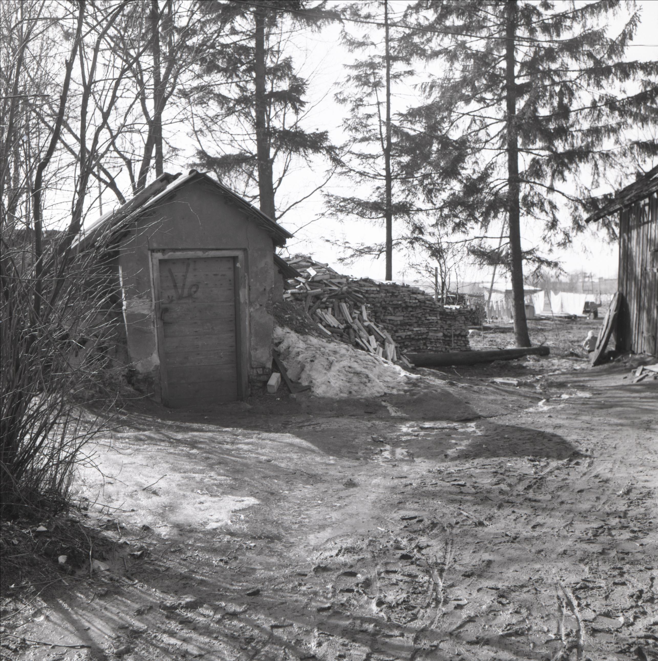 Ēka: Vieta, kur nošauti 1905. gada revolucionāri pie "Staburaga" mājām. Skats uz ēkas pagalmu, redzamas palīgbūves un malkas grēdas.