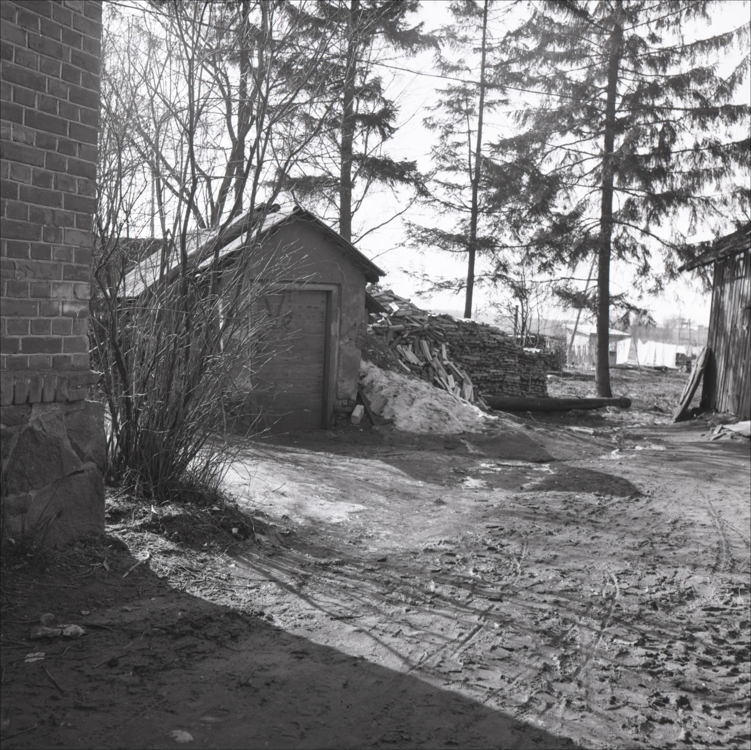 Ēka: Vieta, kur nošauti 1905. gada revolucionāri pie "Staburaga" mājām. Skats uz ēkas pagalmu, redzamas palīgbūves un malkas grēdas. Kreisajā attēla pusē redzama"Staburaga" māju siena.