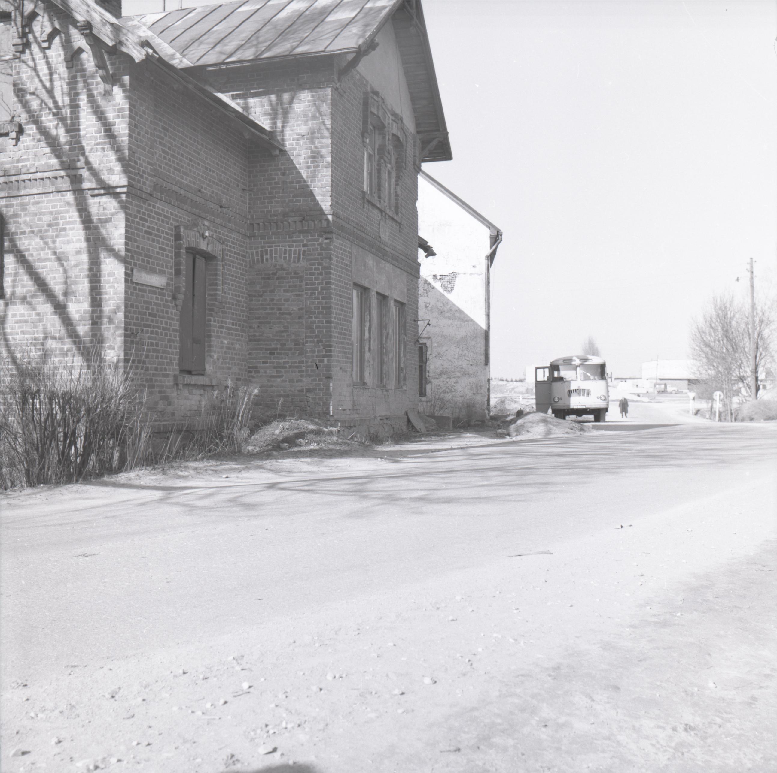 Ēka: Vieta, kur nošauti 1905. gada revolucionāri pie "Staburaga" mājām. Skats uz ēkas ielas puses fasādi. Ēkas fasādes vidū izvirzījums. Uz ielas stāv automašīna.