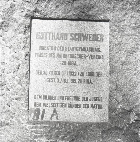 Lielie kapi: Gotharda Švēdera kaps. Kapa pieminekļa tuvplāns. Uzraksts vācu valodā ar G. Švēdera dzīves datiem