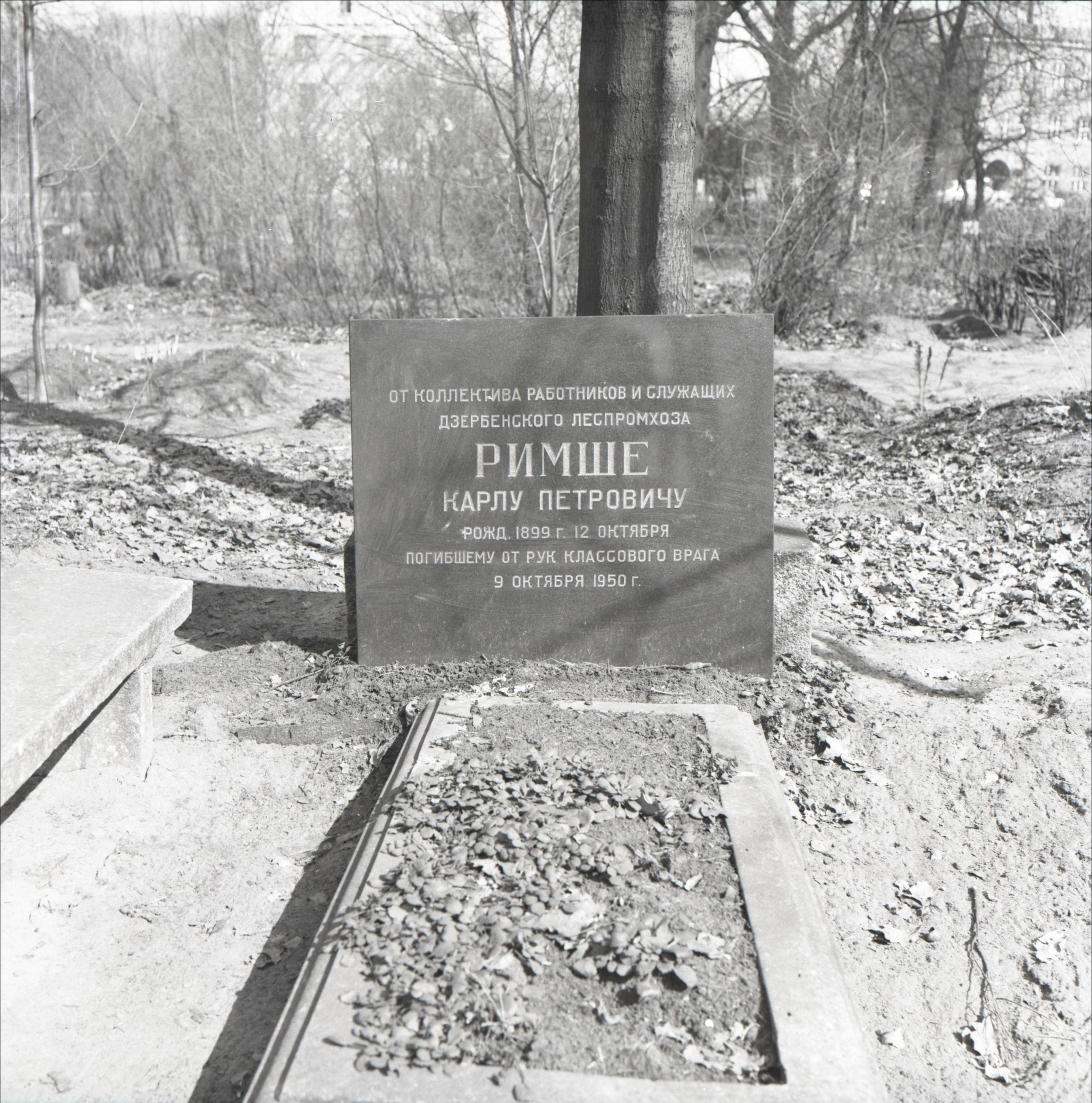 Pokrova kapi: K. Rimšes kaps. Kapa vietas tuvplāns. Kapa vieta ar apmali, pie kapa piemineklis taisnstūra formā, uz pieminekļa uzraksts krievu valodā ar K. Rimšes dzīves datiem.