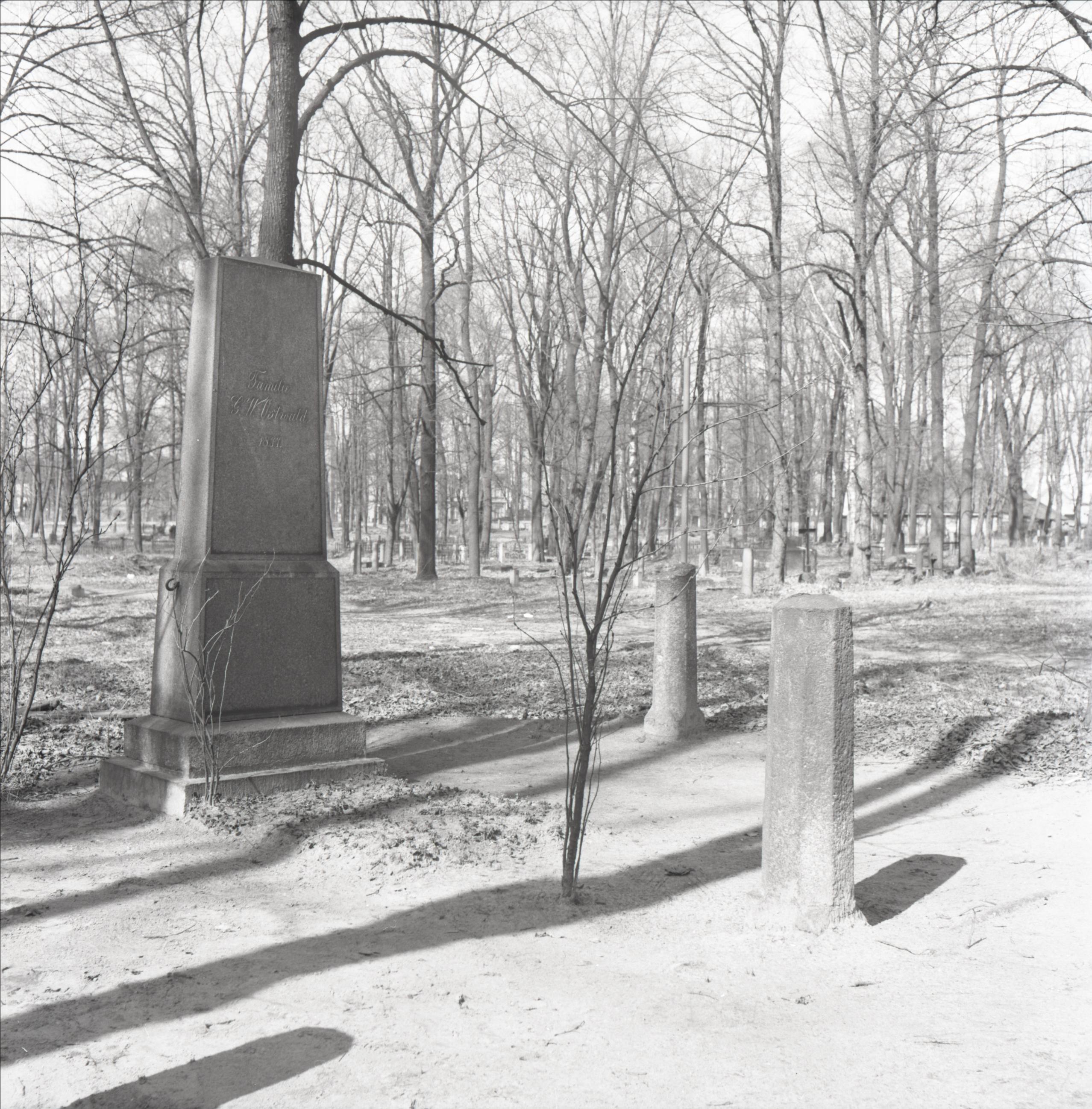 Lielie kapi: Vilhelma Ostvalda kaps. Kapa vietas kopskats. Kapa vieta bez apmales, pie kapa piemineklis obeliska formā, pie kapa akmens stabi. Fonā citas kapa vietas un pieminekļi, tālumā redzamas ēkas.