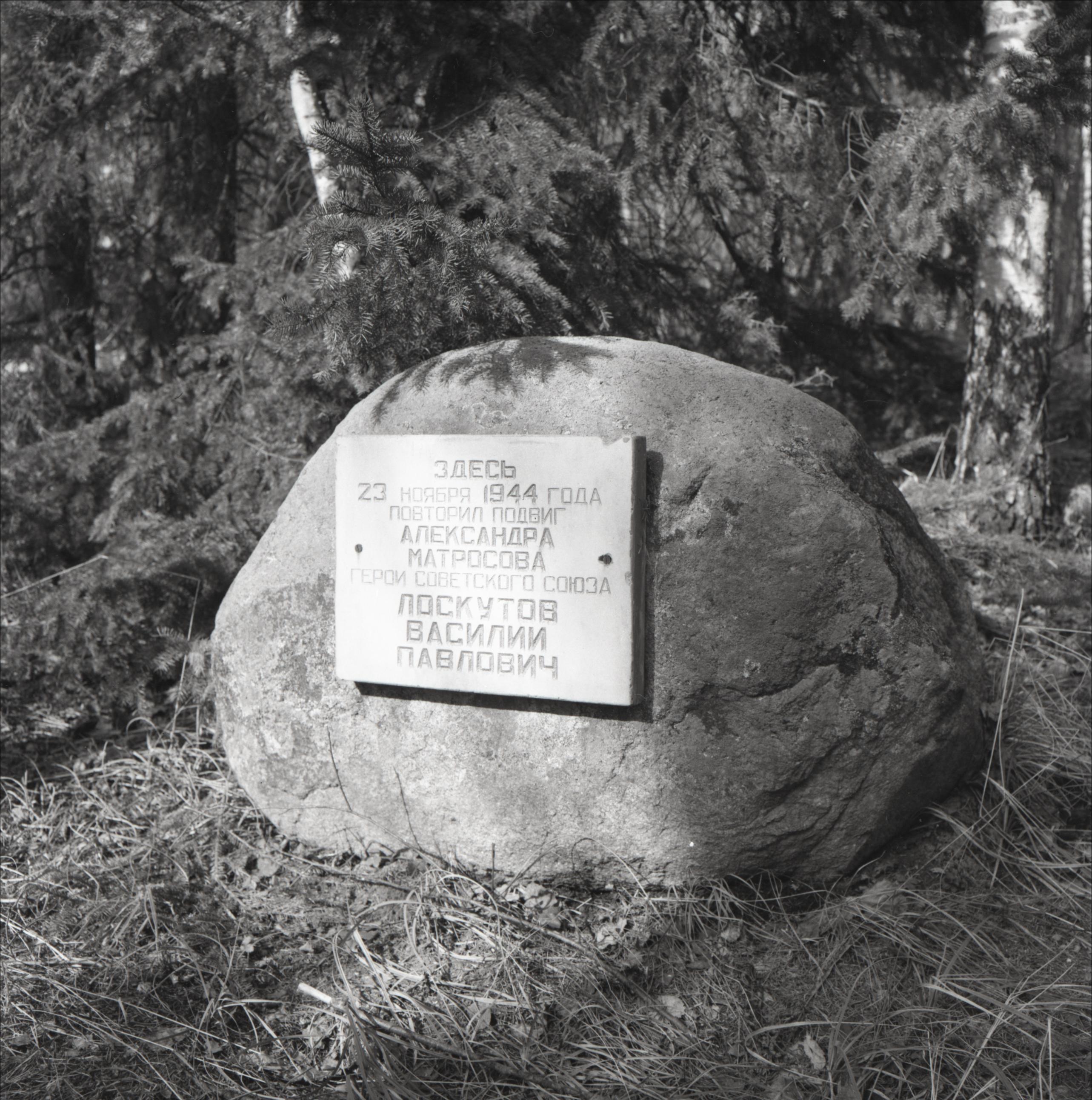 Piemiņas akmens: Piemiņas akmens Loskutovam. Akmens tuvplāns. Uz akmens plāksne ar uzrakstu krievu valodā.
