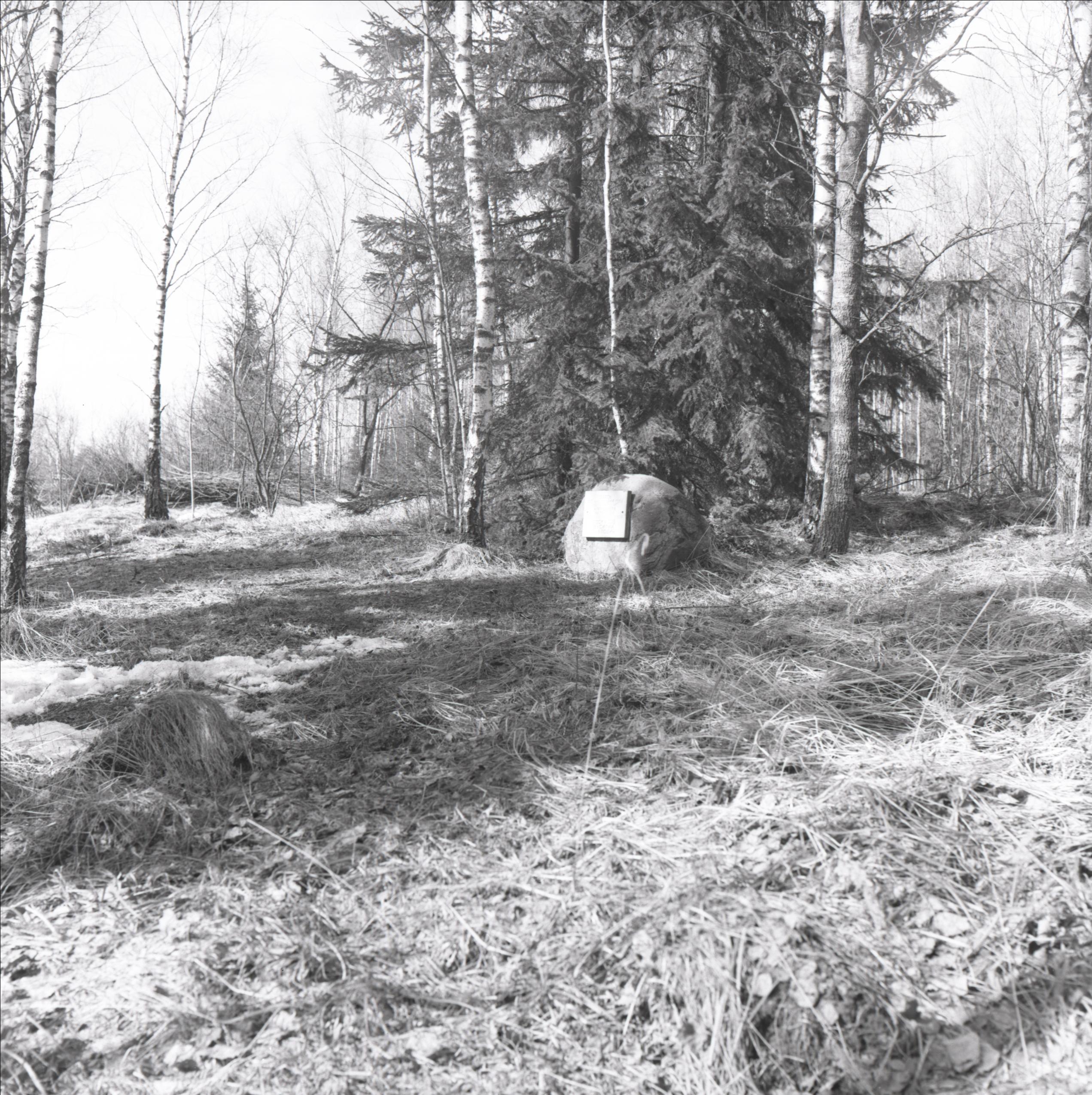 Piemiņas akmens: Piemiņas akmens Loskutovam. Akmens atrašanās vietas kopskats. Uz akmens plāksne. Apkārt koki un krūmi.