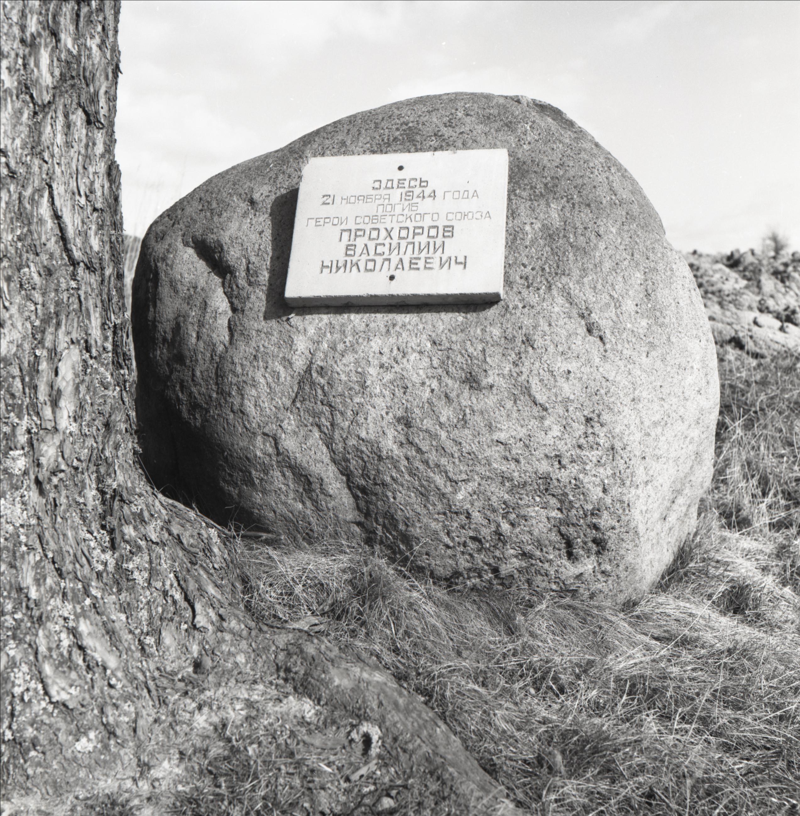 Piemiņas akmens: Piemiņas akmens V. Prohorovam. Piemiņas akmens tuvplāns. Uz akmens plāksne ar uzrakstu krievu valodā, blakus akmenim koks.