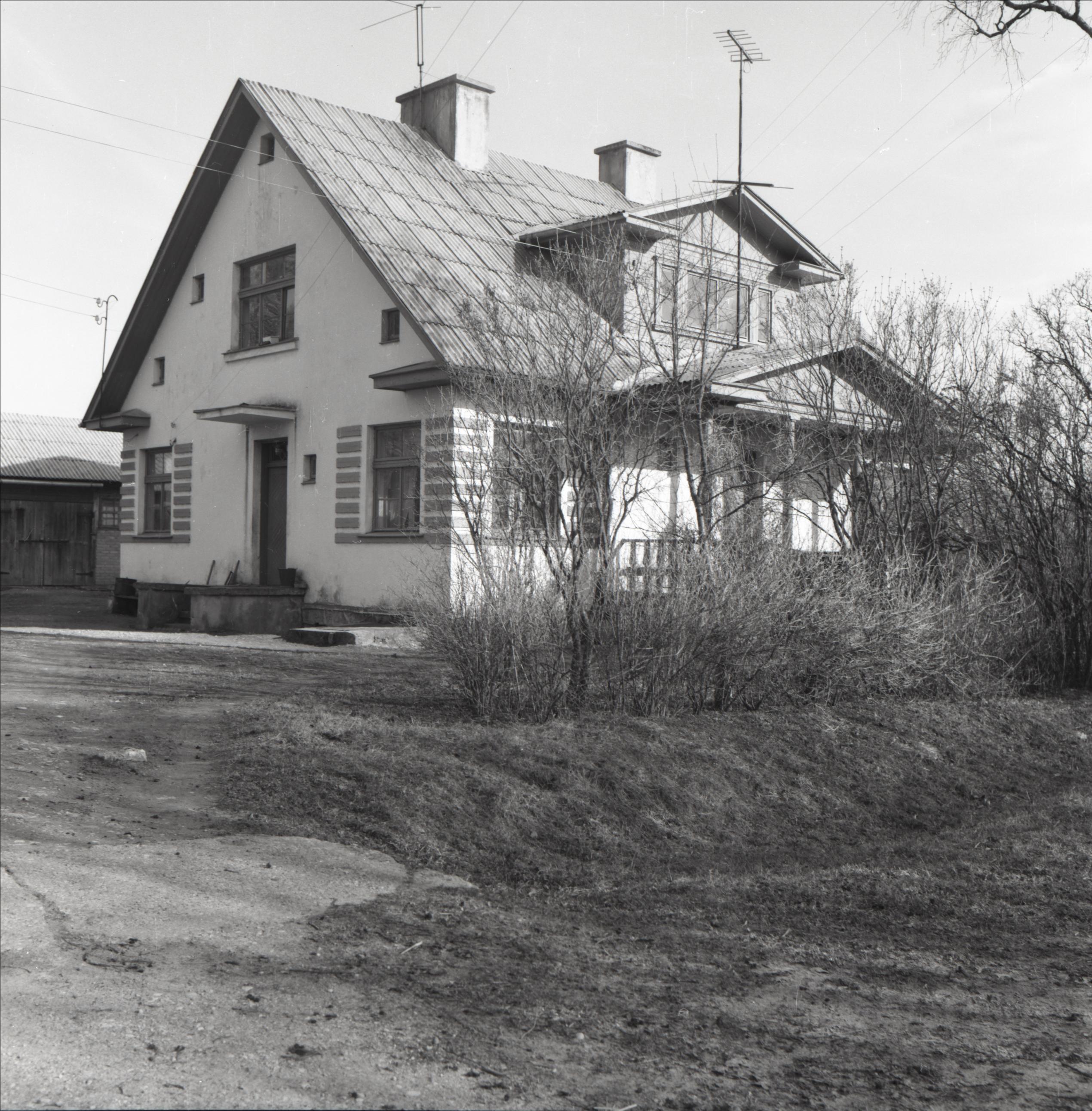 Ēka: Māja, kurā parakstīta kapitulācija. Ēkas kopskats. Vienstāva ēka ar divslīpju jumtu. Skatu uz ēku daļēji aizsedz krūmi.