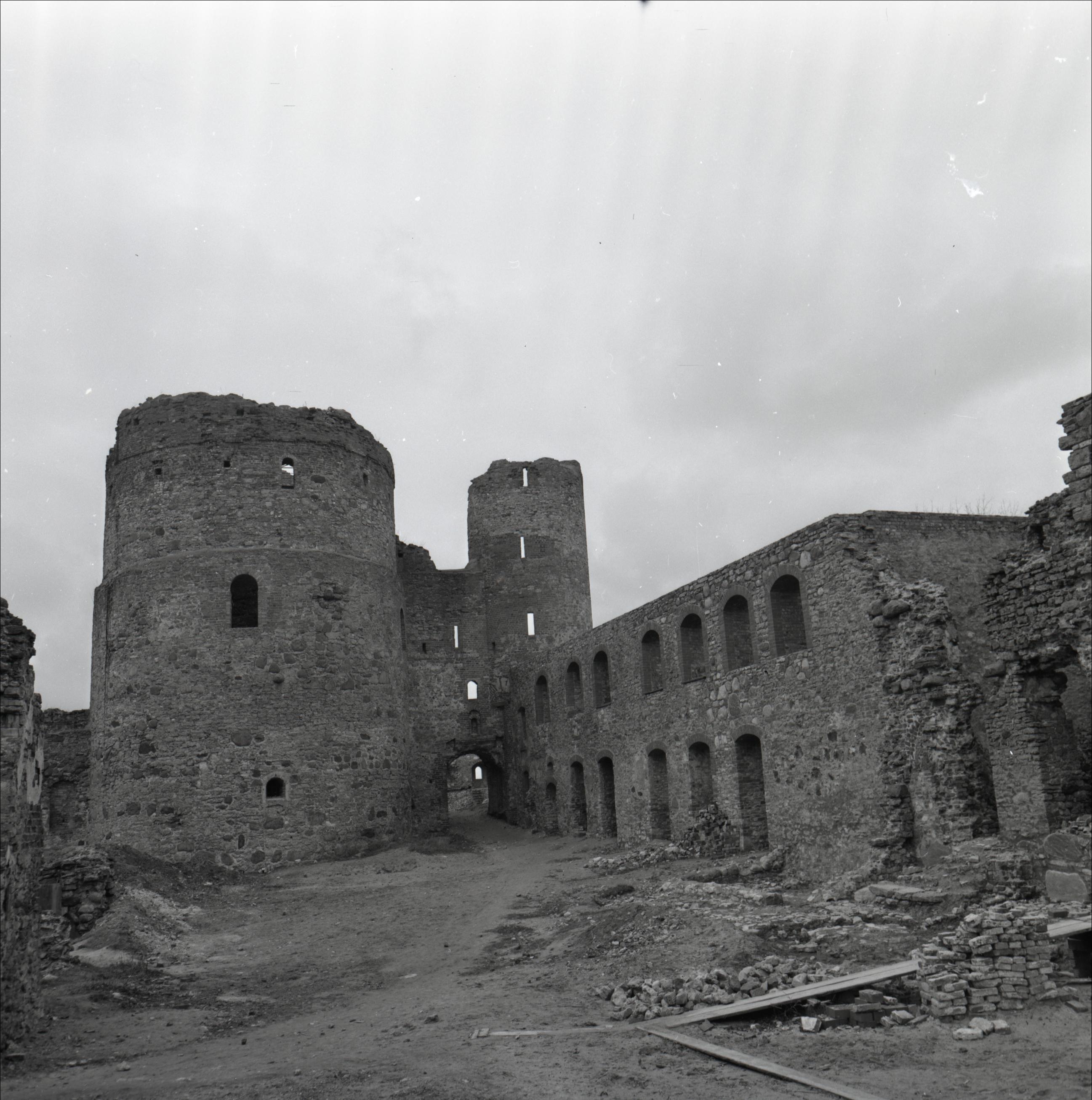 Bauskas pilsdrupas ar parku: Kopskats uzņemts no tilta iekšpuses tornis un siena